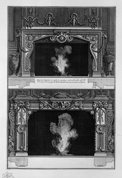Curator: This striking print is titled "Fireplace, two greyhounds, squatting, on the sides, and the Roman she-wolf in the frieze," created by Giovanni Battista Piranesi. It's an engraving, demonstrating his skill in capturing architectural detail. Editor: The scene is arresting, isn't it? A potent mixture of domestic comfort and ferocious iconography. The fire seems almost menacing. Curator: Precisely. Piranesi was a master of visual rhetoric. He highlights the textures of the materials involved, from the rough stone to the meticulously carved ornamentation, reminding us of the labor embedded in these opulent displays of power. Consider how the greyhounds flank the fireplace, rendered with meticulous detail. They act as silent witnesses, underscoring themes of loyalty, status, and wealth, essential commodities in the Roman, and by extension, the contemporary societal structure. Editor: Absolutely. The fireplace, a literal hearth of the home, becomes a stage for ideological reinforcement. The greyhounds and the Roman she-wolf, a symbol of Rome's mythical origins and imperial ambition, speak volumes about the sitter's identity, perhaps aspiring to a link with historical grandeur. Look at the way Piranesi contrasts the smooth lines of the greyhounds with the textured fire— it suggests tension. It draws attention to those who have the luxury of cultivating beauty, but also insinuates a relationship to class. Who has access to such beauty, and under what exploitative practices does beauty operate in relationship to that structure? Curator: It’s essential to note that engravings like these had a practical function beyond aesthetics. Prints like this circulated as commodities within an art market; disseminating ideas, styles and promoting Piranesi’s own virtuosity as a designer and engraver, showcasing skills available for commission. Editor: That's a great point. By reproducing it as a print, Piranesi allows its dissemination and democratizes the visual representation of elite status, to an extent. But it remains tied to systems of power. The idealized image, the allusion to Roman greatness, all work to perpetuate existing hierarchies even through the seemingly mundane object of a fireplace. It really speaks to a constant tension of aspiration. It reminds me of Gramsci’s idea of hegemony and that structures of power rely on symbols to secure social consent and stability. Curator: This image definitely reveals that duality and reinforces those ideologies for contemporary viewers. It becomes so much more than interior decoration! Editor: Absolutely, looking at it that way makes me rethink the fireplace itself, as a cultural artifact! Curator: A fascinating artwork from a historical and a material perspective. Editor: One that pushes us to ask pertinent questions of visual pleasure!