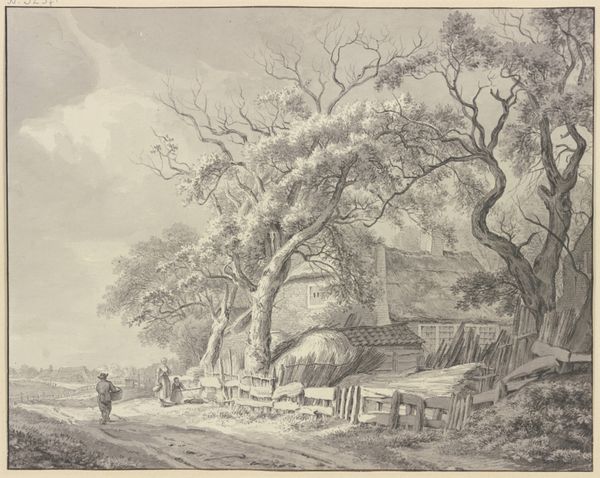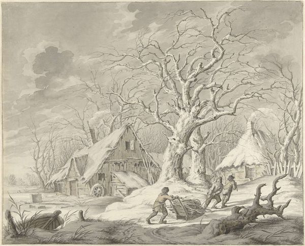 Curator: Just in time for the holidays, isn’t it? Take a moment to admire this delicate rendering of a winter village. Attributed to Egbert van Drielst, this work on display here at the Städel Museum captures a quiet moment in a snow-dusted townscape. Editor: It feels…sparse. Stark even. The monochrome palette really strips everything down to its essence, making the village appear isolated and a little bit lonely. The leafless trees certainly reinforce that sentiment. Curator: Drielst clearly prioritized line and form here, composing with pencil, ink, and chalk to give texture to this very romantic vista. Notice how he utilizes the stark white of the paper itself to render the snow, creating a striking contrast against the darker ink washes used for the sky and buildings. Editor: The skeletal trees really capture my eye. The artist used them to create depth and shadow – particularly that imposing specimen dominating the foreground. Their branches seem to claw at the sky, a rather gloomy dance playing out there in the cold light. It's kind of a romanticized misery, don't you think? Curator: I can see your point. And indeed, romanticism does thrive on emotional intensity, be it joy or sorrow. I appreciate the details in the thatched roofs. The texture suggests the hardiness of the material, those robust strokes implying a humble haven in the face of winter’s wrath. I notice the purposeful inclusion of flocks of birds towards the upper part, imbuing the landscape with a sense of hope, perhaps spring's imminent arrival after a severe winter. Editor: I did feel a hint of hope; there are figures and animals moving within the wintry vista as if waiting for brighter, longer days. Ultimately, it is quite poignant when reflecting on how landscapes are more than picturesque backdrops—they reflect a delicate, interconnected balance. Thank you for drawing attention to these small but powerful details. Curator: Thank you! Indeed, Drielst here not only created a picture, but he shared a feeling, and the memory of a world shaped by nature and by us.
