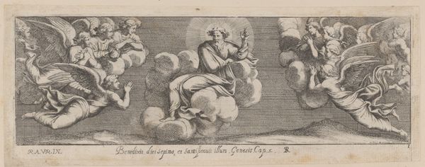 Curator: Here we have "The Assumption of the Virgin, who is seated in the clouds with arms outstretched, angels surrounding her," an engraving by Fra Antonio Lorenzini, dating from 1685 to 1720. Editor: The composition feels... overwhelmingly baroque. All this swirling cloud cover and an oddly frontal presentation of the Virgin. What's your take on this print’s design? Curator: Well, look closely at the interplay between light and shadow. The Virgin’s robes, for instance—see how Lorenzini uses fine lines to create a sense of volume and drapery? The formal dynamism draws the eye upward, emphasizing her divine ascent. Editor: And contextually, engravings such as this, and others by Lorenzini, had significance during the Counter-Reformation, serving as propaganda distributed widely. Consider the cultural and political landscape – art as a tool. It provided readily available imagery and solidified the church position. Curator: An intriguing insight into the societal role of religious iconography. From my perspective, this is also about form. The artist emphasizes idealized proportions to highlight her heavenly perfection. Her pose—arms open—a powerful symbol of grace and welcoming acceptance. Editor: Of course. And let's not overlook the dedicatee "All Ill Sig e Prona mia Coll. La Sig Co. Cortanza." The dedicatee, Iolani Germi Dama. That speaks to the circles of patronage. I wonder how its distribution and impact would differ today. Curator: Returning to a focus on the artwork’s execution, note how the engraver captures a variety of textures - from the Virgin's skin to the feathery softness of clouds using distinct engraving techniques. The density of lines creates depth and complexity. Editor: Indeed. But without understanding the power structures it reflects, we can only see the image, not the forces that produced and used it. A beautiful relic and telling symbol. Curator: Agreed, seeing the print as an historical artifact enhances my appreciation for Lorenzini's artistry, merging intention and outcome into a comprehensive view. Editor: An appropriate synthesis that combines image and historical context in considering such devotional artworks.