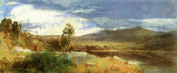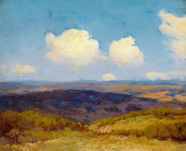 Editor: Here we have "Gathering Clouds" by Benjamin Brown, done with what looks like acrylic on canvas. I'm struck by how muted and melancholic the colors are; there's this feeling of an approaching storm. What do you see in this piece? Curator: This landscape, even without explicit figures, speaks volumes about our relationship to the environment. The "gathering clouds" become a metaphor. Are they gathering because of natural processes, or is there an implication of human impact on the environment, subtly hinting at the Anthropocene? Look at how the land seems both imposing and vulnerable, caught in this uncertain light. Editor: That’s interesting! I was so focused on the atmosphere that I didn’t immediately consider a human element. Are you suggesting the painting prompts a reflection on climate change? Curator: It could. Consider how landscape painting historically has often served to either celebrate the beauty and bounty of nature, often implying colonial domination. But here, the gathering clouds feel ominous, evoking feelings of anxiety. Benjamin Brown is prompting us to confront a less romantic view, pushing us to consider a landscape marked by our interventions. Where do you see such themes in this image? Editor: I think that somber, almost bruised, quality of the blues and purples in the midground. There’s no vibrant green, no sense of thriving nature. It's quite suggestive, really. Curator: Exactly. And how does this shift our understanding of landscape as a genre – what are its political implications, historically and today? Editor: It’s really made me think about how landscapes can be more than just pretty pictures. They can be powerful commentaries. Curator: And remember, questioning is key. Keep asking about the relationships between art, society, and power.
