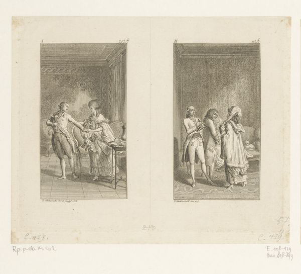 Curator: Bernard Picart created this engraving, "Manius Curius Dentatus weigert geschenken," in 1734. It's part of the Rijksmuseum's collection and depicts a historical scene. My initial impression is how detailed it is, particularly for a work of this scale. It almost feels like a snapshot, or a captured moment from an oil painting. Editor: Snapshot is right! It’s stark. Something about the shading feels raw. There's movement—desperation almost—in those lines. I feel drawn into their small stage, and suddenly the lack of color sharpens my focus somehow, like peering back in time with a very old lens. Curator: I'd agree; there's definitely a theatrical quality to it. History paintings, even in print form, often served a didactic function, reminding viewers of virtuous behavior or historical turning points. Manius Curius Dentatus, the subject here, was a Roman consul known for his incorruptibility. The print likely commemorates an instance where he rejected bribes from the Samnites. It sends a pretty powerful political message, wouldn't you agree? Editor: Totally! I see the drama of refusal etched in every hesitant line! You almost sense he can still hear their hushed persuasive tones, the clash of morality and need right here, in black and white, two hundred and eighty years later. It asks, in every crosshatch: What would you do? Curator: That’s what’s so remarkable: how effectively Picart utilized engraving, with its limitations, to convey such emotion and depth. Prints like this circulated widely, making history and moral lessons accessible to a broader public beyond the elite. Editor: A paper theatre for morality plays, performed endlessly in the hands of common folk, and in that way made very, very uncommon! Thank you! Curator: Indeed, thank you!