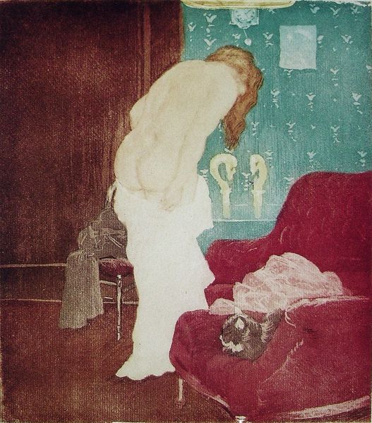 Editor: This tempera painting, "Illustration for The Nutcracker and the Mouse King," was completed in 1924 by Artuš Scheiner. It has a dreamy quality that's both charming and a little unsettling. What can you tell me about this work? Curator: The power of illustrations, especially those depicting fairy tales, resides in their ability to tap into archetypes. Here, we see a girl, caught in the liminal space between childhood and adulthood, encountering a toy soldier that appears very lifelike. What does the soldier represent to her? Editor: Maybe hope? The potential for adventure or maybe even a kind of… protection? I guess fairy tales can have dark elements too. Curator: Exactly! Observe how the artist uses light and shadow. The single candle flame throws dramatic shadows, but does it banish the darkness or amplify the mystery? Also, notice how the palette is mostly cool tones. Do these blues and greens evoke safety or something else? Editor: It's strange. It’s like the warmth of the candle highlights the coldness of the rest of the room. The colors make it less of a happy story, I think. More serious? Curator: Precisely. This juxtaposition is common in Romanticism. It seems the painting acknowledges both the allure and the potential dangers inherent in fairy tales and growing up. They represent the power and dangers of liminal spaces and transformation. Does that add new meaning? Editor: Yes, definitely! I thought it was a simple children's illustration, but there are all these undercurrents! I see it differently now. Curator: Me too! I learn so much with our conversations. Thank you!