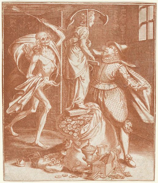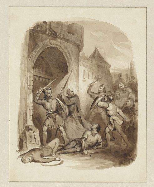 This print, "Knights Fighting in the Crypt of a Church", was made by Henricus Wilhelmus Couwenberg in the early 19th century. He used a technique called etching, a printmaking process that relies on the corrosive power of acid to create lines in a metal plate. The etched lines hold ink, which is then transferred to paper under pressure, resulting in this monochrome image. Consider how the artist manipulated the etching process to achieve varying tones and textures. The depth and density of the etched lines create a sense of shadow and volume, particularly noticeable in the knights' armor and the skeletal figure. The use of etching was significant in the 19th century, as it allowed for the relatively quick and inexpensive reproduction of images, making art more accessible. It's a reminder that the medium itself can have social and political implications, influencing who gets to see and own art. By understanding these material processes, we appreciate how this image speaks to the broader historical context of its time, bridging craft, art, and society.