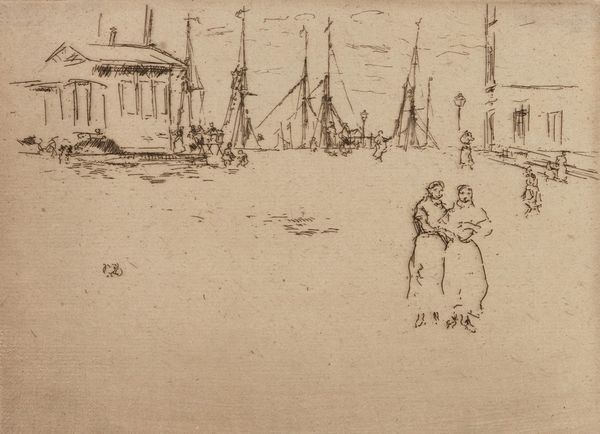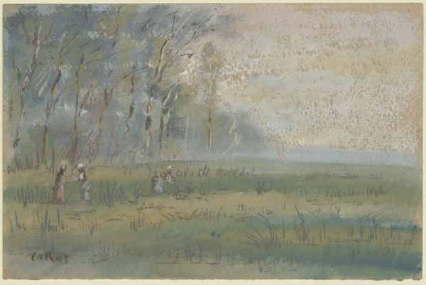 Editor: Here we have Edwin Austin Abbey's "Study for 'A Game of Bowls'," created in 1898. It's a watercolor painting, and what strikes me is the light, almost dreamlike quality despite the realism of the figures. What catches your eye? Curator: I'm drawn to how Abbey uses color to evoke a specific era. The pastel shades, almost faded, speak to a longing for a romanticized past, a nostalgic gaze cast upon earlier forms of leisure. Notice the costumes; what memories or cultural touchstones might they be trying to access? Editor: They seem like something out of a historical drama, all those high collars and wide-brimmed hats! It gives the game a theatrical feel. So, is he referencing specific symbols or meanings through these figures and their clothing? Curator: I think Abbey is intentionally utilizing established visual shorthands. The costumes signal a time of supposed elegance and order, a harkening back to simpler times that is often illusory, though. Even the game of bowls itself— a pastime associated with the leisure classes— is imbued with a certain symbolism of societal harmony and controlled activity. Editor: That’s fascinating! So it's not just a picture of people playing a game. The artist uses elements like the clothes to signify something larger about the era, and ideas about it, right? Curator: Precisely. And think about the choice of watercolor. The fluid, somewhat ethereal nature of the medium contributes to this sense of memory and idealized reflection, lending an atmospheric quality to the depicted figures as if looking back through the mists of time. How does the landscape play into this effect? Editor: I guess the open space contributes to the leisurely feel, making it more serene and removed from, say, an urban environment. Curator: Precisely. In Abbey’s artistic rendering, the simple act of playing bowls becomes a tableau vivant – a meditation on time, class, and the enduring human desire for an idealized past. It offers such insight into his, and our, present moment through careful references. Editor: It’s amazing how much meaning can be embedded in what seems like a simple scene! Thanks for unraveling those layers for me.