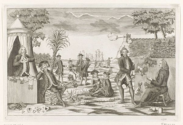 Cornelis de Wael made this print, “Islamitische galeislaven op het strand,” using etching, a printmaking technique that utilizes metal plates. To make an etching, a metal plate is coated in wax, and the artist scratches an image into the wax, exposing the metal. The plate is then bathed in acid, which bites into the exposed lines. This process creates grooves in the metal, which hold ink. When the plate is pressed onto paper, the ink transfers, creating a print. The process demands meticulous skill, requiring the artist to understand the properties of acid, metal, and ink. Here, etching allows De Wael to capture the intricate details of the scene – the textures of clothing, the expressions on faces, the smoke rising from the fire. The lines of the etching create a sense of depth and volume, drawing the viewer into the composition, though the labor involved in this scene is far from visible in the image itself. De Wael's choice of etching reflects a deep understanding of materials and processes, and of the social dynamics and material realities of the early modern world.
