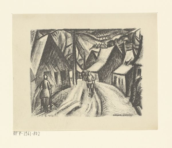 Curator: Here we have Ernst Ludwig Kirchner's "Shed on the Bank of the Elbe," a linocut from 1906. There's something about its starkness that immediately grabs you, doesn't it? Editor: Absolutely. The high contrast, the simplified forms—it feels raw, almost primitive. There's a tension between the industrial elements and the natural world that's immediately palpable. Curator: That rawness, that tension—Kirchner was really wrestling with the changing landscape of Dresden at the time, how industry was reshaping the environment, impacting people's lives. It wasn't always a pretty picture, right? It had grit. Editor: You see it in the bold, almost violent cuts in the linoleum. The buildings aren't just buildings; they're these jagged, looming presences. And look how he renders the sky: slashing strokes that suggest turbulence and unease. Curator: Exactly! It's not just a literal depiction. Kirchner, and the whole Brucke group really, they weren’t just trying to paint what they saw; they were after the feeling of it all. That’s pure Expressionism to me, unfiltered, from the gut. Editor: The composition itself reinforces this. The shed is positioned centrally but somewhat awkwardly, dominating the space without really providing a sense of stability. It’s as if the ground is shifting beneath our feet. It almost looks apocalyptic in its simplification. Curator: And even the choice of linocut, that’s key too. It was seen as a more accessible, almost crude medium, which let Kirchner circumvent those refined artistic tradition norms. This artwork definitely wasn’t about making pretty pictures! Editor: It's a perfect match for the subject matter. The harshness of the medium echoes the harshness of the industrial landscape. The stark black and white reduce the scene to its barest essentials, highlighting the conflicts you mentioned. Curator: Looking at it, you can almost hear the clang of the shipyard, feel the chill wind coming off the river, taste the soot in the air. And honestly? You kind of have to brace yourself, because these guys, they knew how to expose you. They did not turn away from the pain. Editor: Indeed. The 'Shed on the Bank of the Elbe’ captures more than just a scene. It evokes an era of dramatic transformation through powerfully concise formal means, revealing much about the experience of modernity. Thank you for joining me.