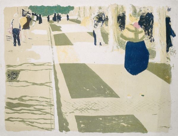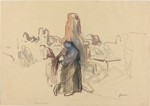 Curator: Edwin Austin Abbey created this intriguing watercolor, "Couple taking a stroll." What are your initial thoughts? Editor: It has an unfinished quality, ghostly almost. The muted palette adds to the sense of a memory, perhaps fleeting, certainly delicate. The city scene gives it a temporal grounding while they are adrift. Curator: Observe the layering and transparency achieved through watercolor washes. Note how Abbey has blocked in certain elements, the coat of one figure in particular. It allows for this striking juxtaposition of the defined and ethereal. Editor: Precisely. Coats, like this figure wears, traditionally represent outward social expression. Yet, the overall treatment makes the coat look as much of a covering or constraint for the soul as the figure projects outward into the world. Do you sense that? Curator: The symbolism interests me greatly. This unfinished style prompts interpretation—the figures indistinct, becoming almost shadows of themselves. This watercolor resists a definitive reading. It’s quite modern in that sense. Editor: Yes, the faceless figures draw my attention back to how identity, in the modern era, is caught between an archetypal past and an unknowable future, don’t you agree? And that these are indeed the universal challenges we face: not being erased from existence! Curator: Considering that idea, I note how Abbey carefully renders architectural features, which may offer some structural permanence. Consider, for example, the geometry of the doorway or the stark repetition of what appear to be windows higher up. There's visual support and stability. Editor: It's true, that geometric grounding suggests the world of civic permanence, which helps explain how those in that past found themselves, in their relation to place. I imagine viewers throughout time consider their civic duty, when looking at an artwork like this. Curator: Ultimately, I believe this watercolor by Abbey provides a subtle exploration of how we visually perceive identity and relationships in pictorial space. Editor: Yes, Edwin Austin Abbey offers us not just a visual encounter, but a spectral dance, resonating across centuries—challenging, moving, and enduring.