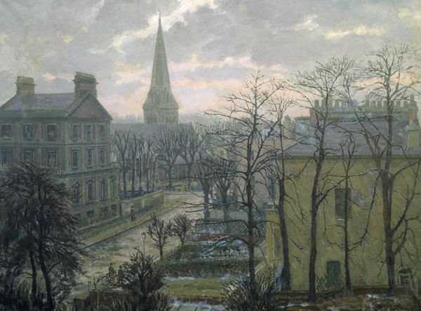 Editor: So, here we have Arshile Gorky’s “Park Street Church,” painted in 1924. It's an oil painting, and the style feels very impressionistic to me. The way he's captured the scene, the busy street below the imposing church... it’s striking. What do you see in this piece? Curator: I see a loaded image, seemingly a straightforward cityscape but pulsing with underlying tension. Consider the time, 1924. Gorky, an Armenian immigrant who had survived the genocide, is painting an iconic symbol of American Protestantism. What does it mean to paint this scene, this place of privilege and power, while carrying the weight of historical trauma and displacement? Editor: I hadn't thought of it that way. The light and airy style seemed almost apolitical. Curator: That contrast is precisely where the tension lies. The impressionistic style, often associated with capturing fleeting moments of beauty, is here deployed to depict a monument representing deeply entrenched systems. The people below, are they included or excluded by that imposing structure? Are they participants in or simply passersby within this societal framework? How might class or religion define how one interacts with it? Editor: So you are suggesting he's not just painting a pretty scene but subtly critiquing the power structures at play? Curator: Precisely. It encourages us to question who has access, who feels a sense of belonging, and who is marginalized in that society. This image is not just about a building, but the power dynamics and identity politics embedded within its very presence. Editor: Wow, I’ll never see an Impressionist landscape the same way again. Thank you for that powerful perspective. Curator: And thank you for opening the door to consider such pressing issues. Hopefully, the art can speak volumes, particularly by telling complicated truths about complex subject matters.