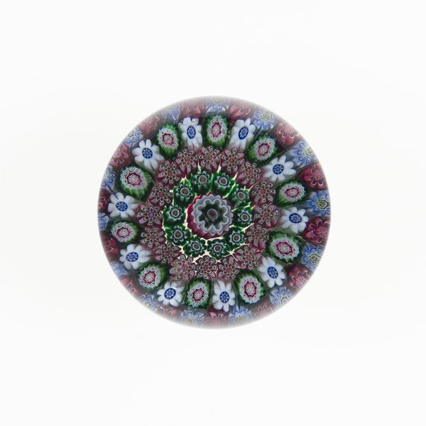 This *Paperweight* was made by the Clichy Glasshouse between 1837 and 1885, and is now held at the Art Institute of Chicago. At just 2 1/2 inches in diameter, the intense detail and precise execution draws you in. The tightly packed concentric rings, formed by the arrangement of millefiori and the central rose, create an immediate sense of order. The pattern, encased in clear glass, is an investigation into symmetry and structure. We see repeated motifs—each a small universe of colour and form— arranged to create a larger composition that is both decorative and deeply considered. The colours, predominantly blues, greens, and pinks, are carefully chosen, reflecting the era's fascination with artificiality and the ability to manipulate nature into highly stylized forms. The paperweight’s structure invites us to consider the relationship between the part and the whole, between the individual element and the overall design. The Clichy Glasshouse challenges us to reflect on the ways in which we perceive and construct meaning through pattern and form.
