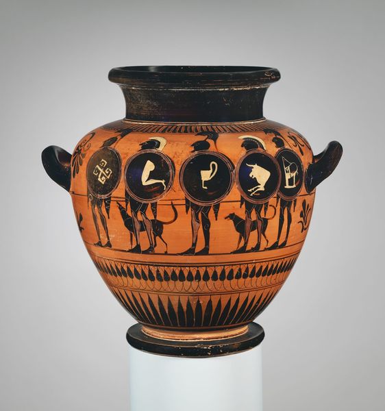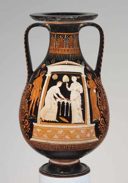 This is a terracotta loutrophoros, a ceremonial vase for water, created by an Ancient Greek pottery maker. Used in ancient Greek rituals, the loutrophoros literally translates to “bath-bringer”, and was employed during wedding ceremonies, where water was carried to ritually bathe the bride and groom, signifying purification and fertility. It was also used as a grave marker for unmarried women, symbolizing a marriage denied in life. The vase's painted scenes offer glimpses into the gendered roles and expectations of ancient Greek society. The images on the vase typically depict scenes of domestic life and courtship, underscoring the significance of marriage as a social and cultural construct. While the loutrophoros embodies celebration and hope, it also encapsulates the complex interplay between identity, societal norms, and individual destinies in the ancient world.