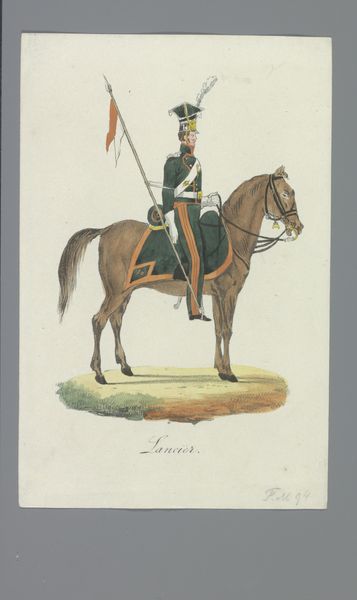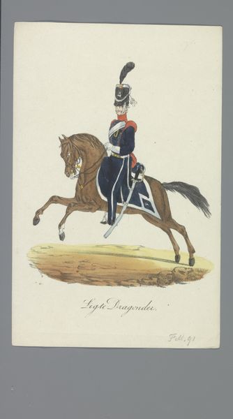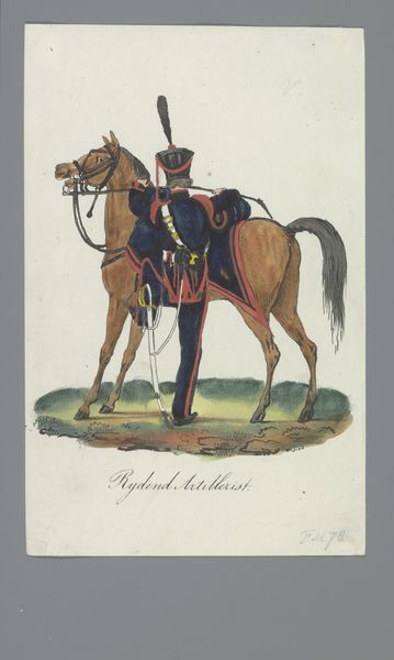 Albertus Verhoesen created this watercolor depicting a cuirassier, a mounted soldier equipped with armor, during a time of shifting military tactics. Note the imposing helmet with its plume, and the gleaming breastplate. These are not merely protective gear, but symbols of power, reminiscent of classical Greek hoplites or medieval knights. Such imagery evokes a sense of invincibility. Consider how the polished metal of the armor reflects light, drawing the eye and emphasizing the soldier's formidable presence. The motif of the armored warrior on horseback has deep roots, appearing throughout history from ancient Roman equestrian statues to Renaissance battle scenes. Yet, by the 19th century, the cuirassier was becoming an anachronism. Observe how Verhoesen’s detailed rendering attempts to preserve the romantic ideal of the soldier even as industrial warfare began to dominate. This tension between past glory and future reality is palpable, stirring a mix of pride and melancholy within us.
