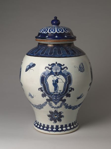 Editor: This gorgeous ceramic vase, dating from 1700 to 1750, is identified as Talavera Poblana, and resides here at the Art Institute of Chicago. I’m immediately struck by its repeating blue and white pattern, a delicate dance across its rounded form. What stories do you think this object whispers? Curator: It murmurs of cultural exchange and adaptation. Blue and white ceramics often evoke Ming Dynasty porcelain, a highly prized import that inspired potters worldwide. But notice how this piece transforms that inspiration. Editor: You mean, it’s not just a copy? How can you tell? Curator: The distinctive, slightly uneven application of the glaze and the more folksy rendering of the floral motifs within the geometric lattice suggests a localized interpretation, wouldn’t you agree? It's drawing from that collective memory of trade and status, but speaking with its own accent. Editor: It’s like a familiar song played with a new instrument! The form itself, with its stout handles, feels so sturdy, so grounded. What sort of emotions are these symbols trying to unlock? Curator: Precisely. Think about what a vase traditionally represents – holding, nurturing, display. Now imagine this particular vase displayed prominently. The intricate patterns act as a visual mantra, quietly broadcasting the owner's sophisticated taste and access to global currents. The feelings would be belonging and pride. Does that connect with your impressions? Editor: It definitely reframes it! I was initially caught up in the visual appeal, but hearing about the cultural influences has really deepened my understanding. Curator: Indeed, this vase holds both beauty and history within its ceramic embrace, speaking volumes about its place and time.