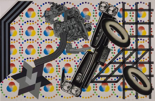 Editor: So, this is Peter Phillips' "1. TURBOsonic," currently held at the Tate. No date listed, intriguing. It's…loud, isn’t it? Visually, I mean. The rainbow palette mixed with the motorcycle engine feels unexpected. What do you make of it? Curator: Unexpected, yes, a visual cacophony perhaps? But that’s where the fun begins! Phillips, a pop art pioneer, often juxtaposed seemingly disparate imagery – in this case, sleek machinery with playful, almost cartoonish rainbows. It’s a commentary, I believe, on consumer culture. Editor: Consumer culture? How so? Curator: Think about it: the fetishization of speed and power, represented by the engine, alongside the alluring promise of colourful, mass-produced goods. It's a heady mix, isn’t it? Did you see this at first glance? Editor: No, not really. I was too caught up in the odd combination of elements. I see it now, though. I guess it’s easy to forget that pop art isn’t always celebratory; it can be critical, too. Curator: Exactly! And perhaps even a little bit… cheeky? A visual wink at the viewer.