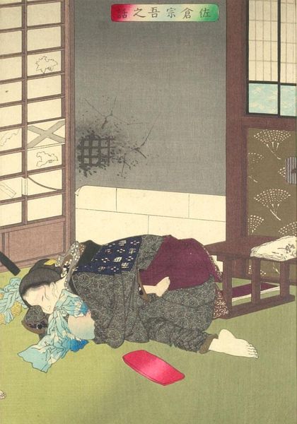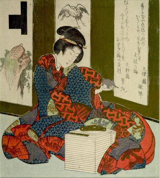 Editor: This is Yashima Gakutei’s "Woman Holding a Letter Box," a woodblock print. She seems lost in thought, maybe contemplating the letter's contents. What does this image evoke for you? Curator: I see a powerful commentary on women's limited agency in expressing themselves. The letter box becomes a symbol of both connection and confinement, reflecting the societal constraints placed upon women and their communication during that era. Editor: Confinement? I hadn't considered that. Curator: Indeed. How might her physical posture – seated, enclosed – reinforce these ideas of restricted expression within a patriarchal structure? This connects to broader discussions around gender and communication in 19th-century Japan. Editor: That’s a very interesting, and thought-provoking perspective!
