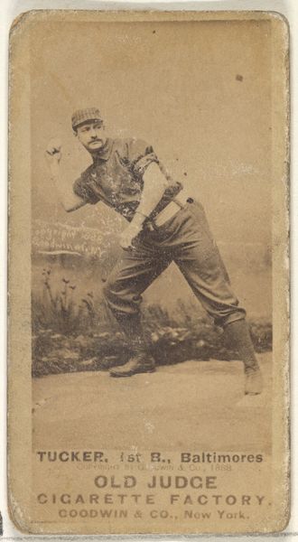 Goodwin & Company produced this baseball card of Myers C. Robinson around 1888 as part of the Old Judge Cigarettes series. The sepia tone lends a nostalgic air to the depicted action on the field, captured in a rectangular format designed for mass production. The composition is structured around the diagonal line of Robinson’s body, creating a dynamic sense of movement. This line is counterbalanced by the horizontal figure of the sliding player, resulting in a visually engaging contrast of vertical and horizontal forces. The limited tonal range emphasizes the forms, highlighting the textures of the uniforms. These baseball cards were essentially commercial products, but also representations of cultural values. The photographic realism suggests an objective capturing of an event, yet the framing and composition tell a carefully constructed story of athletic prowess and competitive spirit. The card is not merely a record; it is an artifact embedded in a network of meanings related to sport, commerce, and American identity.