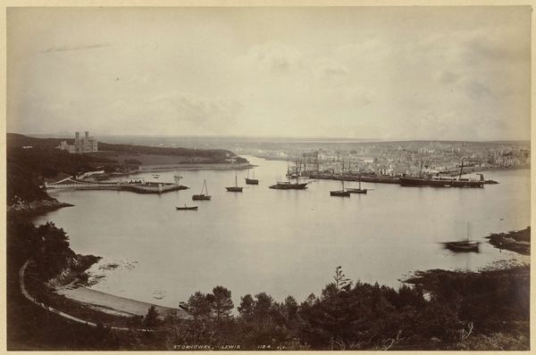 Editor: This is a photograph taken by Alfredo Noack around 1870-1890, showing the new harbor of Genoa with a training ship. It has such a quiet, reflective mood to it. The sepia tones make it seem almost dreamlike. What do you see in this piece, beyond just the surface of a harbor scene? Curator: You know, for me, looking at this, it’s like stumbling upon a memory, not my own, but one inherited, maybe from a distant ancestor who once dreamed of sailing. The Scuola Officina di Redenzione sul mare...it sounds almost poetic, doesn't it? School of Redemption on the Sea. Think of the hopes and anxieties of those young sailors on that ship, the dreams of far-off lands mingling with the harsh realities of maritime life. Do you think that knowing its Genoa alters how we respond? Editor: Definitely. There’s something inherently romantic about Genoa. That detail makes it all come alive. It does make you think about individual lives amidst this big harbor. So, would it have been considered a documentary photograph then or something else? Curator: Ah, that's the fascinating tension, isn't it? It’s documenting a reality – the new harbor, the training ship – yet filtered through Noack's lens, literally and figuratively. It transcends mere reportage. It's about capturing a specific atmosphere, a moment in time, a whisper of human ambition against the vastness of the sea. It's also so visibly an art of the time and its limitations. Look at those soft edges around the edges of the frame. You almost expect the sea to be breathing around it, you know? Editor: Yes, that’s it exactly. The ‘breathing’ quality makes it so immersive. Curator: Exactly! That breath is time moving, carrying that boat. So thanks for making me breathe it too. Editor: And thank you, as well!
