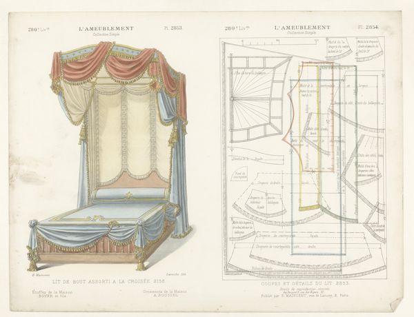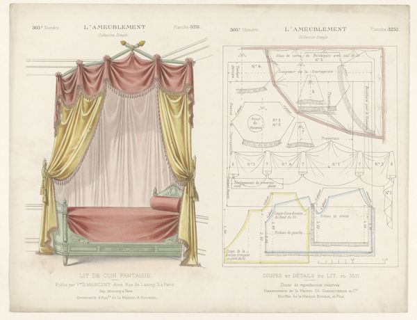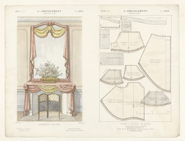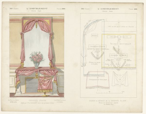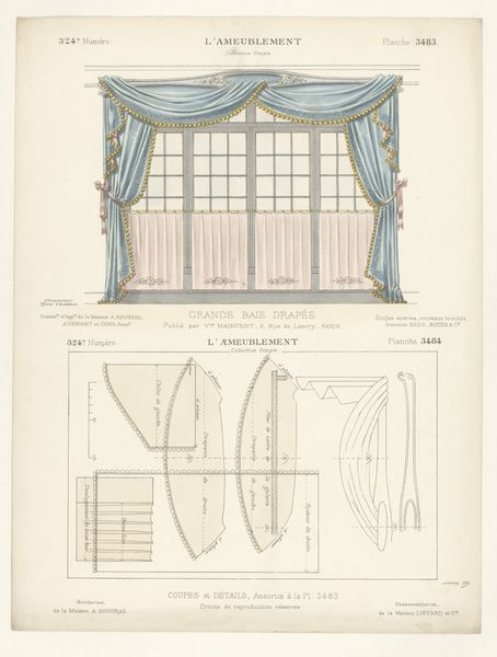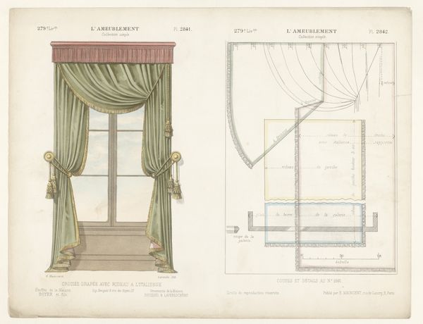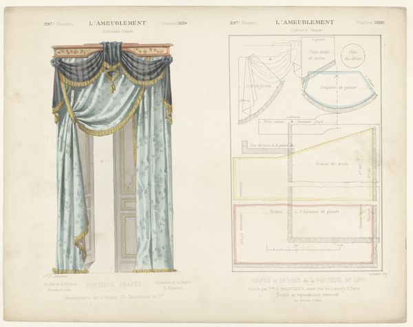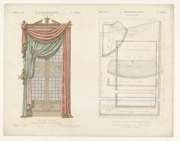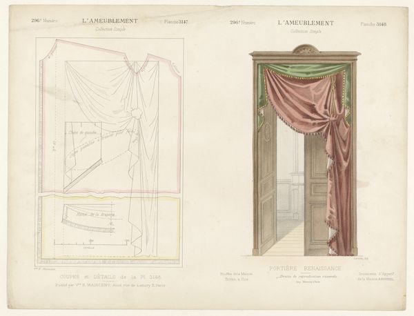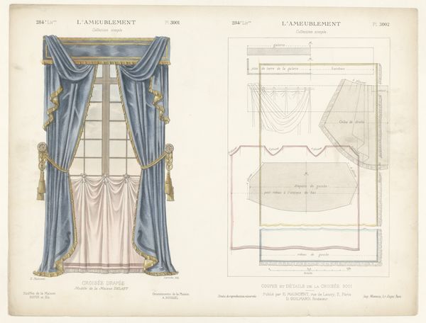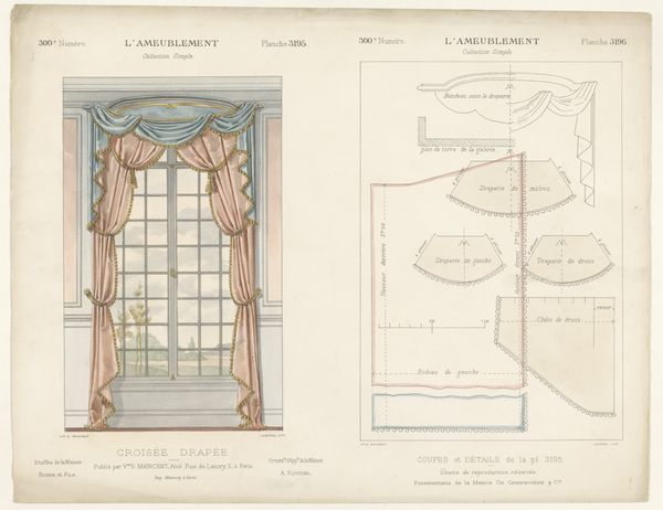 This print, ‘Venster met gordijnen’ by Léon Laroche, shows a window draped with ornate curtains, rendered with precise detail. But it isn't just the *image* of curtains that's interesting here; it's what the image tells us about the broader world of design and production. The print is bisected: on the left, we see the curtains as they would appear in a well-appointed interior. But on the right, we see the disassembled pattern pieces, complete with measurements, seams, and trimmings. Notice the intricate detailing, especially the tassels and the careful draping. These required skilled labor, representing hours of work by someone trained in the art of tailoring and upholstery. This image invites us to consider the social context of luxury and labor. How much would these curtains have cost? Who would have been able to afford them? And what does their design say about the values of the society that produced them? By looking at this print, we can see beyond the surface of decoration and glimpse the complex relationships between materials, making, and the social world.