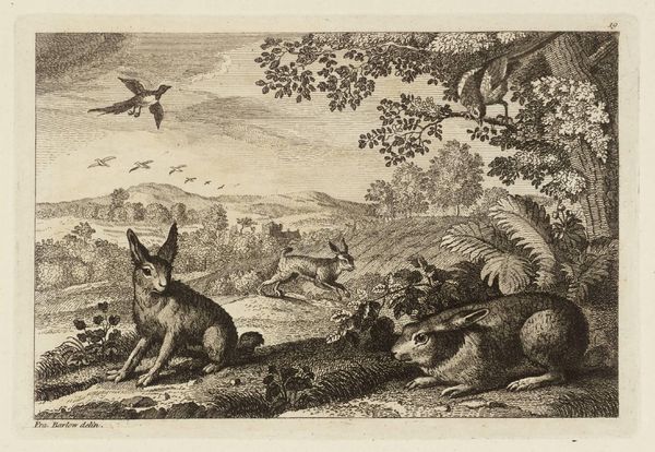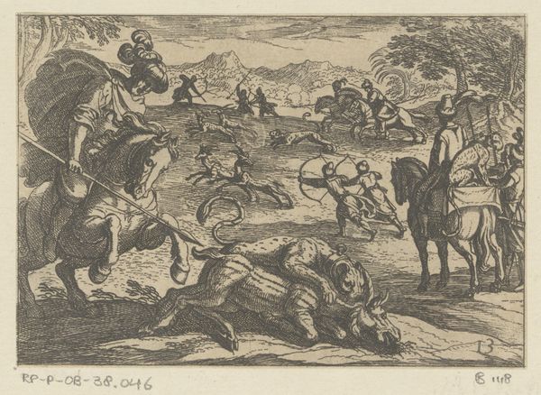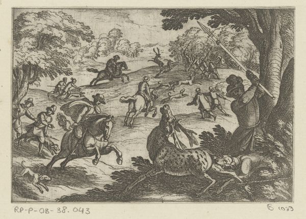 Editor: This is Antonio Tempesta's "A Stag Hunt," a small etching showing a chaotic hunting scene. It's incredibly detailed for such a small work. I’m curious, what persistent symbolic meanings do you see at play in depictions of the hunt? Curator: Well, hunting scenes are powerful symbols. They often represent the dominance of man over nature, a motif deeply rooted in classical and Renaissance art. The stag itself can symbolize nobility or the hunted soul. Do you notice how the chaos contributes to a sense of the wild, primal, and perhaps even dangerous nature of the world? Editor: I do see that. It's a dynamic scene, for sure! I hadn't considered the stag as a symbol of the soul. Curator: Exactly! The chase taps into something primal within us. It evokes themes of pursuit, desire, and even mortality. Editor: That gives me a lot to think about – the hunt as a reflection of human desires. Thanks!