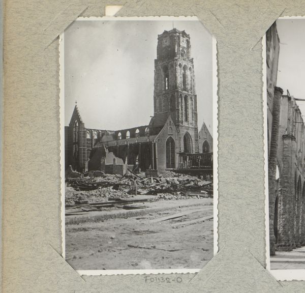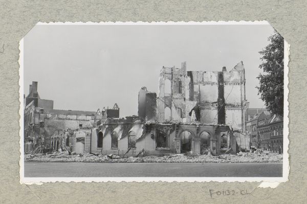 J. Nolte captured this photograph of cyclists riding past the ruins of the Victoriahotel on Willemsplein in Rotterdam. The composition of the image is striking: the foreground is dominated by rubble, sharply contrasted by the more distant skeletal remains of the hotel. The monochromatic palette emphasizes texture, from the rough debris to the crumbling facade. The cyclists introduce a stark contrast between human scale and the monumental destruction of war. This play of scale serves to underscore not only the physical devastation, but also perhaps the resilience of everyday life continuing amidst such ruin. The ruins themselves become a kind of anti-monument, a testament to absence and loss rather than presence and power. In this semiotic framework, what was once a symbol of urban sophistication is now a signifier of destruction, prompting reflections on the fragility of civilization. The photograph’s formal qualities thus encourage us to consider the complex interplay between destruction and continuity, and the ways in which ruins can challenge our conventional understandings of history and progress.