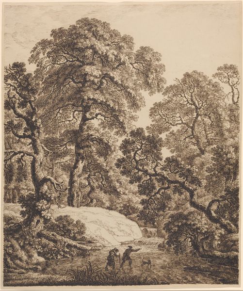 Editor: Here we have John Martin's "London from Primrose Hill," a small-scale watercolor. The hazy distance and soft brushstrokes create a dreamy, romantic feel. What do you see in the composition? Curator: The composition employs a tripartite structure: foreground, middle ground, and background, each defined by contrasting tonal values. Note how the arrangement of trees and the subtle undulation of the terrain guide the viewer's gaze toward the distant cityscape. Editor: So, it's less about realistic representation and more about… visual organization? Curator: Precisely. The artist is manipulating pictorial elements to evoke a particular aesthetic experience. Consider how the rounded arch at the top echoes the organic forms below, unifying the composition. Editor: I hadn't noticed that before! It definitely brings a sense of closure. Curator: Indeed. Analyzing these formal relationships reveals the artist's strategic choices in shaping our perception. Editor: This close looking really changes how I see the work.