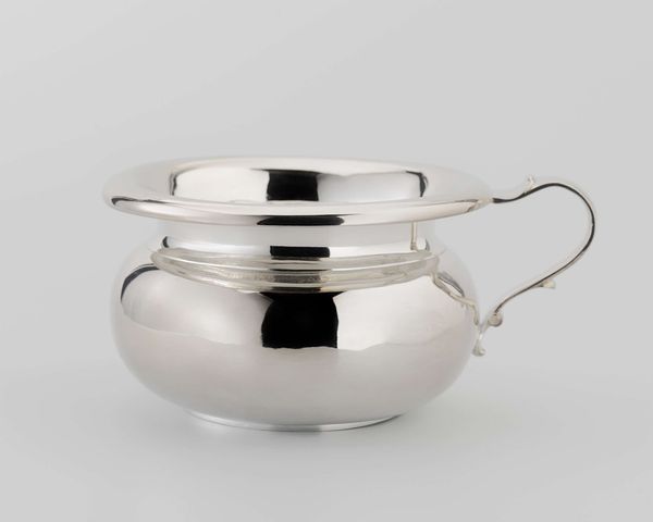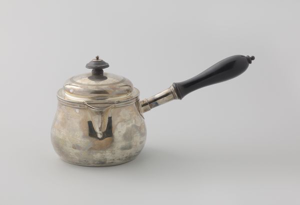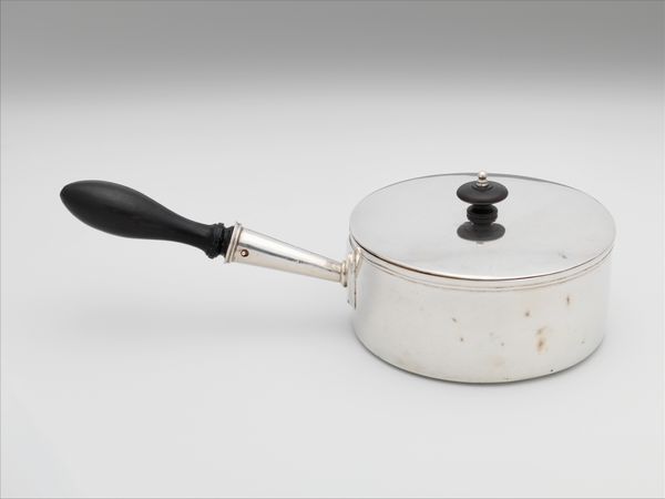 Curator: Here we have a piece of Dutch Golden Age silverware: a "Steelpan met deksel met het familiewapen Van Beaumont", or saucepan with lid bearing the Van Beaumont family crest, crafted in 1793 by Jan Hendrik Middelhuysen. Editor: My immediate thought is how brilliantly the artist used such reflective surfaces. The curvature of the metal really grabs the light and throws it back. Curator: Indeed. Silverware of this kind was less about pure utility and more about displaying status. Think about the historical context: the Dutch Golden Age, a period of immense prosperity fueled by global trade. This piece would have signaled not only wealth but also lineage. Editor: Yes, the composition reinforces this reading. The curve of the pan body contrasts beautifully with the straight handle, creating a subtle dynamism. And consider the play between the cool silver and the warm, dark handle—presumably wood? The juxtaposition gives it a sculptural quality. Curator: The coat-of-arms is quite intriguing. Though somewhat obscured, it’s clear that the family wanted their identity embedded within an object of everyday use, subtly reminding those around them of their position within the complex Dutch social hierarchy. Editor: Right, that emblem operates as a sort of symbolic keystone, linking individual artistry to broader systems of power. But let’s also consider the skill of the silversmith. Look at the detailing, the smooth finish—it’s quite remarkable craftsmanship. Curator: It reminds us how intertwined culinary arts, design, and social class were. Owning something like this suggests leisure, influence, and the capability to commission personalized objects—something largely out of reach for much of the population. Editor: Absolutely. So, seeing it divorced from that context now allows us to scrutinize both its aesthetic merits and the historical complexities woven into its making. Curator: Precisely. The steelpan stands as a silent, shiny artifact of Dutch history, where the material realities of a merchant society intersected with personal identity and artistic craft. Editor: In viewing this saucepan, my understanding has been enriched by insights into its construction, its utility, and its placement within the cultural milieu of the Dutch Golden Age.