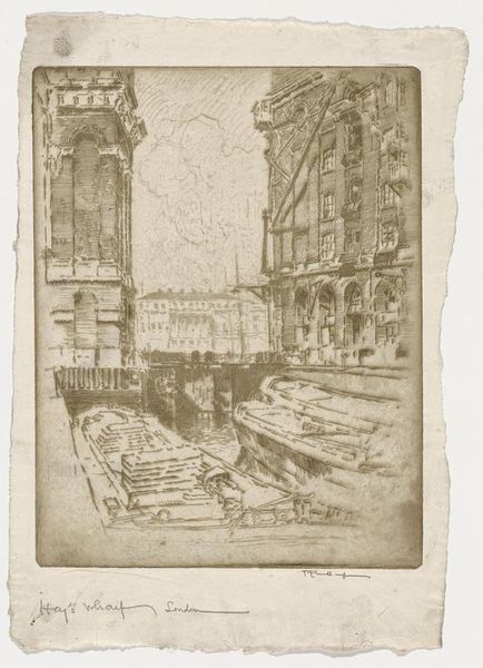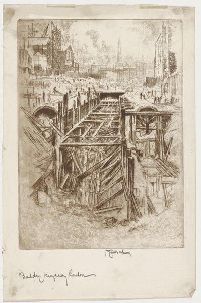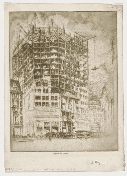 Joseph Pennell created the print "The Telephone and Telegraph Foundation" using etching and aquatint. Pennell was an American expatriate, known for his prints and drawings of architecture and cityscapes. In this print, we are plunged into the raw, unfinished underbelly of urban construction. What does it mean to depict, not the towering achievements of modernity, but the messy, disruptive, and often unseen labor that makes it possible? Pennell was part of a generation grappling with the rapid transformation of cities and industrialization. He presents us with a view of progress that acknowledges the chaotic, disruptive nature of building and construction. The faceless laborers who toiled in these spaces are noticeably absent, raising questions about who benefits from progress and whose labor is erased in the march toward modernity. Consider the social and economic inequalities that are often embedded in urban development.