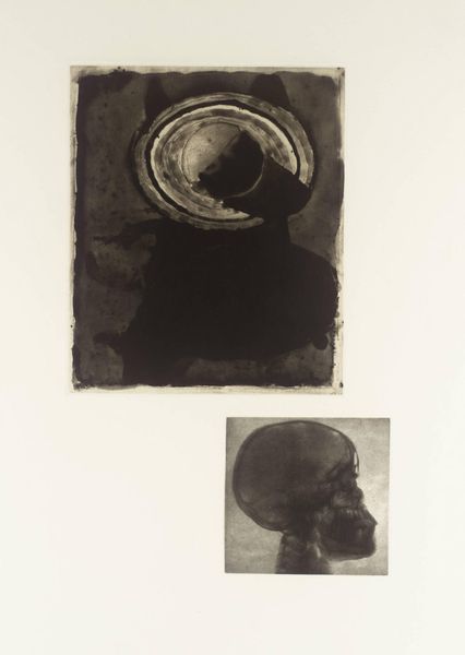 Curator: Terry Winters created this untitled print, held in the Tate collection. It’s a study in contrasts, featuring two distinct images. Editor: My first thought is that there's an intriguing sense of fragmentation here. The rough texture of the orb against the skeletal foot—it suggests a breakdown of wholeness, a kind of deconstruction. Curator: Winters often explores scientific and organic forms, blending abstraction with representation. The orb, densely patterned, recalls cellular structures or geological formations. Editor: Indeed. The composition, with its stark monochrome and isolated forms, emphasizes the inherent materiality of the print itself. It's as though we're invited to dissect not just the images, but the medium itself. Curator: It makes you wonder about the relationship Winters intended between the sphere and the foot. Is it about grounding, about the earth and our connection to it? Or something else entirely? Editor: Perhaps it's about mortality. The foot, so clearly skeletal, reminds us of our physical limits, while the orb hints at the vast, unknowable universe beyond. Ultimately, the artist gives space to contemplation. Curator: An open-ended conversation indeed.