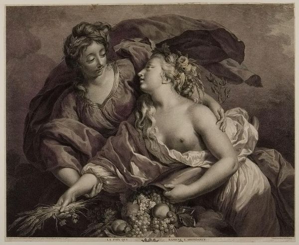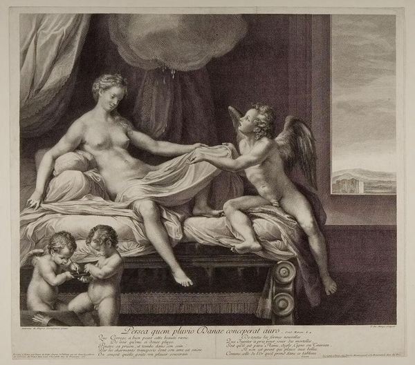 Curator: This is Pietro Marco Vitali's "Venus's Unclothed Beauty Admired by a Satyr," a work that presents a classical mythological scene. Editor: The engraving strikes me as theatrical, the draping fabric creating a stage-like setting. The light seems very carefully controlled. Curator: Vitali is engaging with a longer history of the male gaze in art, depicting Venus as an object of desire within a social and mythological hierarchy. Editor: Yes, but note the dynamic tension between the figures, achieved through the diagonal lines of Venus's body against the satyr's gaze. Curator: We can also see this work as a commentary on power dynamics and the historical subjugation of women, viewed through a patriarchal lens. Editor: Perhaps, but the precise gradations of light and shadow are expertly rendered, giving volume and depth to the forms. Curator: It's fascinating to consider how these classical narratives continue to shape our understanding of gender and sexuality today. Editor: Indeed, its formal qualities remain a testament to artistic skill.