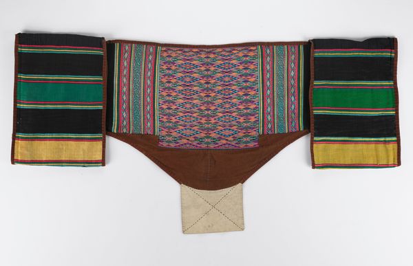 Editor: Here we have an early 20th-century textile from the Dasht-i-Kipchak culture, known as a 'Segusha'. It's crafted from silk and cotton using weaving techniques. I'm immediately drawn to the bright colors and how the geometric patterns seem to dance across the surface. What stands out to you about this piece? Curator: The "dance," as you put it, is central to its charm! It’s a lively performance of color and form, isn’t it? For me, though, it's about that incredible balance. Imagine the artist choosing each thread, balancing that vibrant palette… There's an amazing harmony considering all that visual noise. Do you think that harmony tells us anything? Editor: Well, perhaps it speaks to the cultural context? Was this Segusha made for a specific purpose or occasion? Curator: Exactly! It most likely served a ceremonial purpose. Consider the precision of those geometric motifs woven from silk and cotton threads… Do you see a story hidden in the colours and symbols used? Editor: I hadn’t thought of that! The patterns remind me a bit of Greek keys but seeing it as potentially symbolic makes me think they could have been carefully chosen, passed down, maybe representing prosperity, protection or... kinship? Curator: Kinship, absolutely! This wasn't just decoration; it was communication. Imagine the hours spent, maybe by a group of women, pouring their collective intentions into it. Knowing this shifts your perception of it, doesn’t it? Editor: Completely. It transforms from just a beautiful textile to a piece filled with history and intention. Thanks for highlighting that! Curator: And thank you for noticing the "dance"! That intuitive response is exactly what keeps art alive.