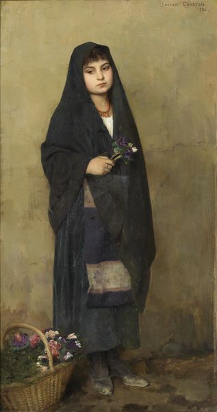 Curator: Welcome. We are standing before Sir John Everett Millais’ painting "Charlie is my Darling." It is rendered in oil paint with attention to light and texture, and exemplifies the portrait style. Editor: The figure’s somber expression is so evocative, despite the details blurring together a bit! Her stance seems both composed and hesitant. Curator: Indeed. Note the strategic use of chiaroscuro in modeling her face. This Romantic painting certainly leans into the sentimental and emotional. The bright skin stands out, illuminated against the shadowed surroundings and darker garment. Editor: I can't help but read this portrait as laden with symbolism. The very title points towards a specific 'Charlie,' suggesting a romantic interest or perhaps a familial connection with political overtones, possibly alluding to Bonnie Prince Charlie and Jacobite sympathies. Curator: Fascinating, and that informs your understanding of her pose? Her clothing definitely denotes high status and formality. I am interested in how her accessories—the hat, the riding crop—contribute to the overall composition. Editor: Precisely! The riding crop isn’t just a prop. The very action of clasping that crop could indicate readiness and a spirit of action! Curator: Agreed. There is that suggestion of the 'outdoor' or country pursuits, as distinct from the formal studio portrait setting, with the suggestion of landscape as texture. Editor: The Romantic style combined with those specific iconographic symbols…Millais' composition isn’t just pretty; it is narrative. Curator: It seems fair to propose this is a statement piece. A psychological portrait masked as a style. Editor: Very much so. I'm compelled to dive deeper into the historical context surrounding 'Charlie' and Millais himself to unpack all that it might hold. Curator: And from a purely formal perspective, considering its compositional elements provides such compelling insight too.