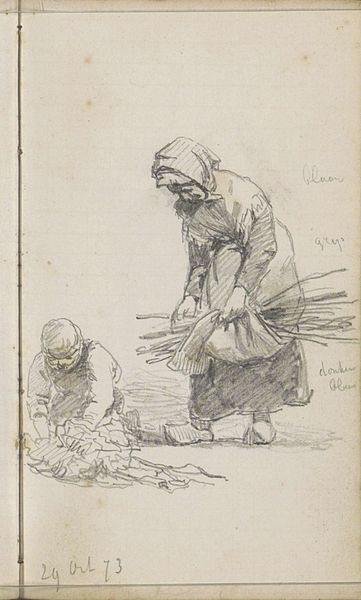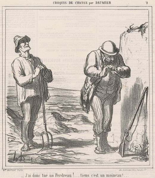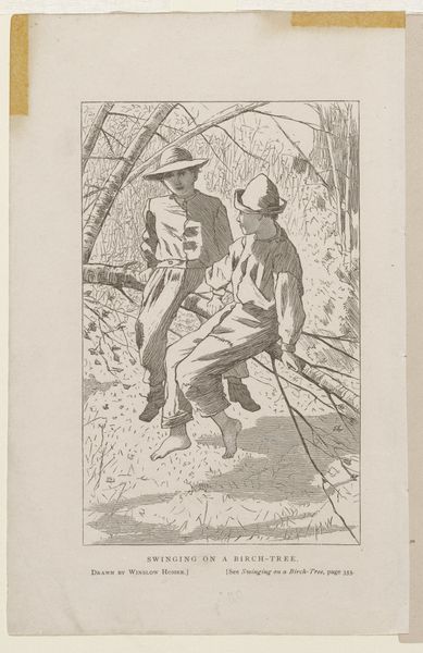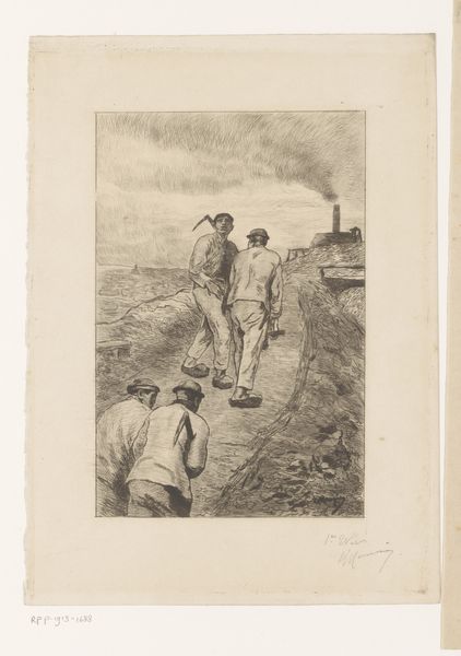 Curator: Looking at this print, "Illustration til Holger Drachmann, \"Juli,\"" created around 1880 by an unknown artist, one immediately senses the rural setting, captured in delicate etching. It belongs to the collection of the SMK, Statens Museum for Kunst. Editor: My first impression is the sheer physicality of labor etched into the scene. The composition is so stark, black and white contrasts giving it this almost documentary-like feeling. I wonder what sort of commentary the artist intended by placing so much emphasis on their work. Curator: The cultural symbolism is quite interesting to observe in such scenes. Holger Drachmann was a notable figure, and the specific choice of "Juli," July, hints at themes linked to summer's labor, ideas of fruition. You almost imagine, perhaps, Drachmann celebrating the working-class with nostalgia in mind, finding simple virtues to set an example in his writing. Editor: Exactly. Look at these two figures, likely farmhands scything hay. I want to examine the societal undercurrent. Considering the period, late 19th century, we’re in the thick of the Industrial Revolution. Could this image serve as a political commentary, even a lament for the disappearing agrarian lifestyle amidst urbanization? Curator: The etching technique adds a historical quality—each line seems intentional, contributing to an aura of enduring rural practices, despite new technologies rising during the time. In regards to labor and symbolism, this would've been a way of paying respect. Editor: That's a valid reading. It is not about nostalgia but recognizing the value of manual work during enormous societal shift. Curator: The choice of material is significant, etching is a meticulous printmaking method—almost as if, with that careful process, the artist paid close attention to these individual workers whose stories must've gone unheard in this transitional time. Editor: It makes me contemplate how this portrayal impacts representations of laborers, their identities—often overlooked, particularly considering intersectional perspectives relating to class. Curator: Reflecting on the art, I realize how deeply entrenched images become in solidifying narratives over generations. These depictions can spark dialogues and provide frameworks through which viewers see history. Editor: Precisely. It reveals how images function in preserving stories. Looking closely allows the dialogue to exist within and outside of the boundaries of our current day.
