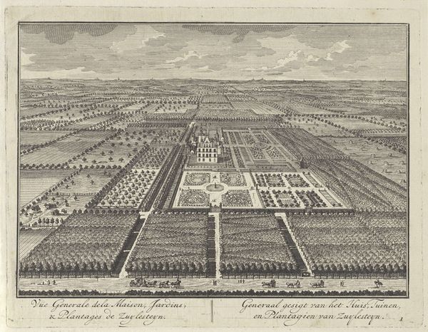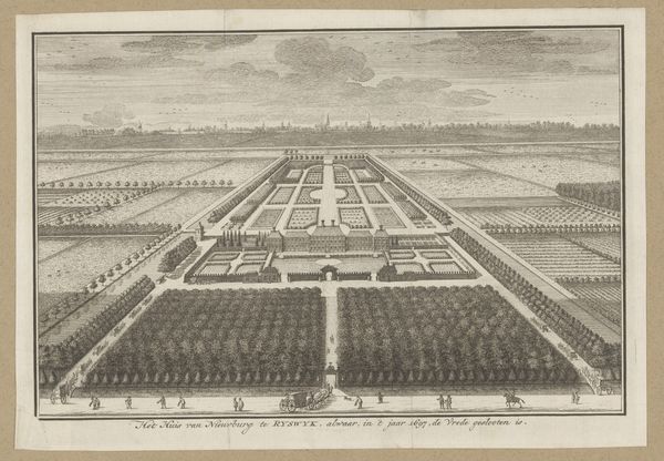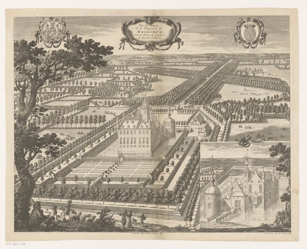 Editor: So, this is "Barrington, The Seat of Edmond Bray, Esq.," a print made between 1712 and 1768 by Johannes Kip. It's a watercolor drawing offering a bird's-eye view. It feels very... planned. Everything is so neatly arranged! What strikes you when you look at this, Professor? Curator: It whispers to me of order, of humanity’s playful attempt to tame nature. Look at those symmetrical lines of trees, mirroring each other across the landscape. A house isn’t just a house here, but a declaration, a statement etched onto the land. A very confident one. But do you see a tension, perhaps, between that rigid control and the soft, almost yearning, texture of the watercolors? Editor: I do. It’s like a stage set – grand, but slightly… unreal. The perspective feels off somehow, and the colors are almost too delicate for such a powerful estate. Does that have something to do with the Baroque style? Curator: Absolutely! The Baroque often danced with spectacle and drama. This piece tries to depict grandeur. It's also fascinating to think about who this print was made for. The emerging middle class? Edmond Bray showing off his estate? Each possible answer colors the way we interpret every little fountain, every carefully placed shrub. The people are nearly stick figures and tiny! Did they actually intend that? Editor: Wow, I hadn't even considered the audience. I guess that shapes everything. I definitely see the 'stage set' now, and thinking about Bray showing off the seat differently now too! Curator: Precisely! It’s like history whispering through the brushstrokes, isn’t it? Editor: Yes! I see it. It is hard not to see the land grab from such a grand estate portrayed, like claiming a place in the land and culture through it's sheer presence. Thanks for helping to explain all of this. Curator: My pleasure. A landscape is never just a landscape. Now, what does *this* land make you hungry for, really? What sort of seed does it plant in you?