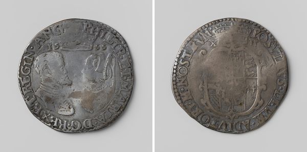 Editor: This medieval print, called "Rekenkamer van Brabant te Brussel," was made anonymously around 1512. It's crafted from metal, using a relief print technique. It looks to be some sort of coin, and immediately I’m drawn to the heraldry, the lion rampant in particular. How would you interpret its iconography? Curator: You’ve immediately spotted the heraldry, good eye! Notice how the imagery is not merely decorative. In heraldry, the lion often signifies courage, nobility, royalty, strength, and valor, traits any governing body would want to project. Do you see any other repeated symbolic elements here? Editor: There are shields within shields. That feels meaningful, maybe nested layers of authority? Curator: Precisely! These repeated motifs acted as visual shorthand for the complex political and social hierarchies of the time. And look at the inscriptions surrounding the images—Latin phrases embedding this coin within a historical and intellectual framework. In coins, these are carefully designed to influence perceptions of value and power, and transmit these ideas to others. How effective do you think it would have been at the time? Editor: Actually, quite clever! It's more than just currency, it's a portable symbol of power and stability. Something people would carry and see every day. That repetition… Curator: And those images would become lodged in collective memory. These icons and the associated mottos reinforce the authority it represents across generations. Currency such as this plays a central role in shaping political and cultural ideology through symbols. Editor: I hadn't thought about it that way, how coins and similar objects become so deeply entwined with identity and power! Curator: Exactly, it shows the staying power of visual symbols. It makes me think about contemporary iconography and the visual systems that influence our behaviors. What new awareness can be acquired through careful scrutiny of cultural relics!