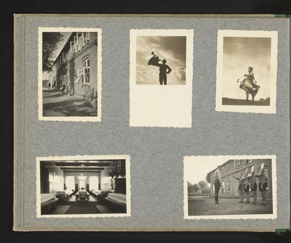 Curator: This intriguing collection of images, entitled "Diverse afbeeldingen waaronder een mogelijke reproductie van een brandplaatje," is from the period 1900 to 1950. The album itself seems to be an intimate glimpse into a life, captured through photographs, prints and drawings on paper. What strikes you first about its appearance? Editor: Well, I am immediately drawn to the monochrome palette and the clear structure within the collection, the sharp division in images draws me to each individual composition. There's a definite grid aesthetic, which is lovely. Curator: It truly gives one the sense of a private journal, a visual diary perhaps reflecting on the early to mid 20th Century. The photographs hint at both the personal, the portraits, and the landscapes of everyday life in the Netherlands at this time. Editor: Absolutely. And considering each photograph, there’s such depth in the black and white contrast which emphasises a sense of temporality; a capture from one's personal history. You mentioned the landscapes, what specific elements capture that? Curator: The photograph depicting a canal lock, for instance, illustrates the Dutch mastery over water, yet also speaks to the socio-political realities of water management and its importance in the national identity. The boat laden with people offers an equally rich social canvas. Editor: Semiotically, that canal lock suggests so much more than water control. It represents the divisions within society and access to resources—or lack thereof—the gatekeeping, if you will. Curator: Precisely, that reading resonates deeply. And alongside these photographs of individuals and sites we see artistic prints with clear references to social allegiances and resistance of sorts at that time. This collection isn't merely aesthetic; it's a repository of memory, a mirror reflecting the turbulent decades it spans. Editor: It prompts one to wonder about the unseen hands that arranged these images with care, crafting meaning through the adjacency of images. I find that idea almost romantic. Curator: Yes. And, when we consider this entire work as a piece itself, we have a collection offering multiple access points and a glimpse into various intersecting topics of memory, and experience through a challenging period of change in history. Editor: It certainly enriches our understanding of photographic practices of that era, and the narrative value they embody collectively as a group.