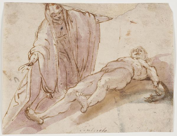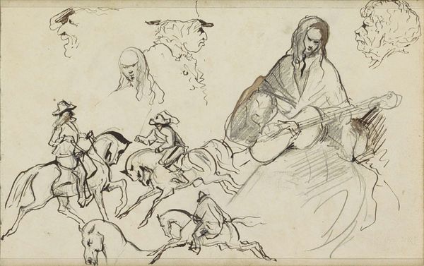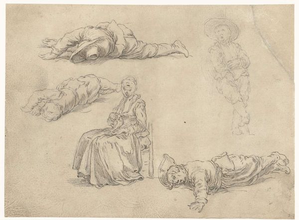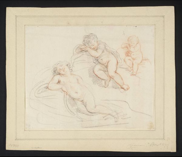 Editor: We're looking at "Study for the figure of Mary in the Nativity in the Prado, Madrid, and two studies of a sleeping Christ Child" by Federico Barocci, dating from around 1597. It's a pencil drawing. It feels unfinished, almost dreamlike. I'm curious – what elements of composition stand out to you most prominently? Curator: Note first how Barocci contrasts the delicate lines forming the figure of Mary with the heavier shading used for the sleeping Christ Child figures. Consider also how the negative space around each grouping isolates them, emphasizing each form as an independent study. Can you observe any connection across these elements? Editor: Well, I see the way Mary’s gaze is directed downwards, seemingly toward where the Christ Child would eventually be positioned in the final painting, creating a visual link between them despite their physical separation in this sketch. Curator: Precisely. And what of the texture created by the layering of lines? Barocci isn’t merely defining shapes; he’s building form through density of mark-making. Note how in some instances, we see what seems to be red chalk augmenting a study in pencil, yielding an interesting study of combined media within one unified work of art. How does this interplay with light? Editor: The varied pressure of the pencil creates highlights and shadows, especially noticeable on Mary’s drapery and the infants' limbs, lending a sense of three-dimensionality despite the flat surface. So he’s exploring volume and light in preparation for the larger painting, I imagine. Curator: Indeed. It's the syntax of light and form, constructed through line, that animates this composition. Considering his strategic use of negative space and controlled execution of pencil strokes, what is left, and what does it suggest? Editor: This has been a fascinating deconstruction! Seeing how Barocci builds form through such deliberate mark-making and contrasting techniques provides a richer understanding beyond just the subject matter. Curator: Yes, a vital skill that any good editor must practice, even now.