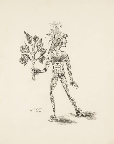 Editor: This is "Fool with a Flower" by Cecil Collins. It’s a simple ink drawing, but the figure’s arched back and delicate reach towards the flower give it such vulnerability. What do you see in this piece? Curator: I see a potent commentary on the role of the marginalized individual in society. Collins, active during periods of great social upheaval, uses the figure of the fool – historically a figure of both ridicule and wisdom – to question societal norms. Where does the flower fit, do you think? Editor: Maybe the flower represents something beautiful and fragile that the fool is trying to protect, or understand? Curator: Precisely. It also asks us to reconsider who we deem ‘foolish’ and whose perspectives we value. Perhaps it's about finding beauty and resilience in unexpected places. Editor: That's given me a lot to think about. Thanks! Curator: My pleasure. It’s always about questioning our preconceived notions, isn't it?