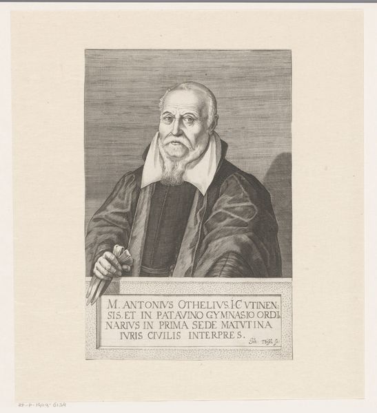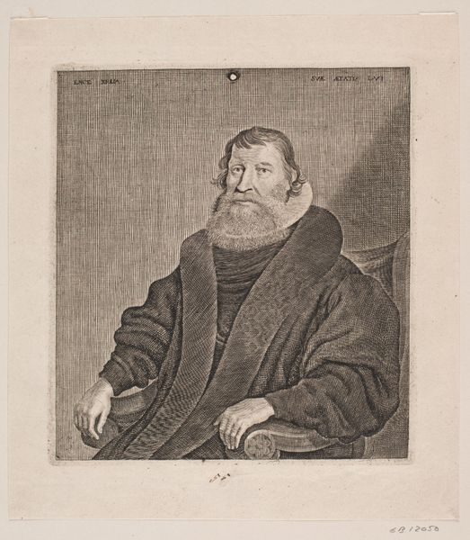 Curator: Here we have a portrait etched by Jean Jacques de Boissieu in 1803, titled "Portrait, after David Teniers the Younger." Editor: The first thing that strikes me is the incredibly rendered texture and the intimacy it evokes, despite being a reproduced print. He has a wonderful, weary gaze. Curator: It’s quite remarkable, isn't it? The image consciously mimics the style of David Teniers, capturing not only the likeness of the subject but also invoking Teniers' artistic era and style. Notice how the collar is not simply ornamental. Editor: Yes, that's very intentional. It reminds us of sumptuary laws in earlier periods, signaling class status even as fashion evolves. Boissieu is playing with our visual understanding of historical hierarchy, but within the changed social fabric of the early 19th century. Curator: Precisely. The image within the image also draws my attention, a smaller piece hanging behind the subject. This embedded image might give clues regarding the depicted individual’s allegiances, tastes, or stories within his narrative. Editor: And consider the hands clasped so calmly; the hands were so often symbols of action or craft, especially in portraits during the Enlightenment era. Here, there's a kind of passive, learned elegance that seems calculated, almost like a subtle resistance. Curator: You highlight such crucial dynamics. It’s easy to forget that, in portraying another work by Teniers, Boissieu isn’t just copying, but also offering his commentary on artistic tradition and authorship. He interprets not just the person but their place within social constructs. Editor: Boissieu creates more than just a copy. By reinterpreting, he poses important questions about what portraiture communicates, what constitutes authentic selfhood, and how artistic echoes carry through revolutions and changing power dynamics. Curator: This reminds me that art often communicates by allusion, suggestion, and the weaving together of references across time and space. Editor: Absolutely. And by analyzing those allusions, we glean further knowledge on these artworks and the contexts in which these pieces were born.