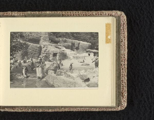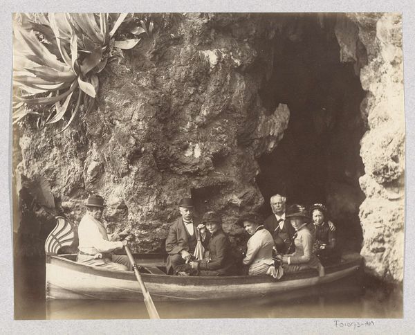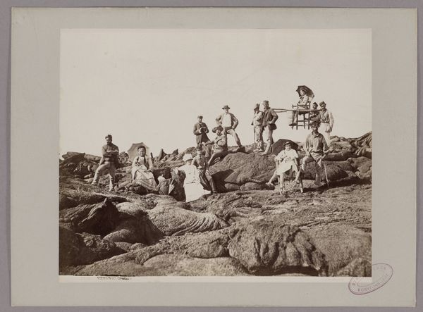This photograph, 'Groep mensen zittend op rotsen met parasols,' was produced by Constant & A. Lory Peigné. It's an albumen print, a process invented in 1847, which renders the image from an emulsion of egg white. The result is a glossy surface that gives the photograph a distinctive richness and depth, evident in the tonal variations of the rock formations. The albumen print process was laborious, demanding skill and precision in coating the paper, exposing the print, and then developing it. The presence of parasols suggests a leisure context, hinting at the emergence of photography as a medium associated with tourism and the middle class. The photograph is an object of material culture, capturing a moment in social history. Understanding the material and techniques used gives us more insight into the cultural context in which it was made, questioning the boundaries between photography as a commercial enterprise and as a form of artistic expression.