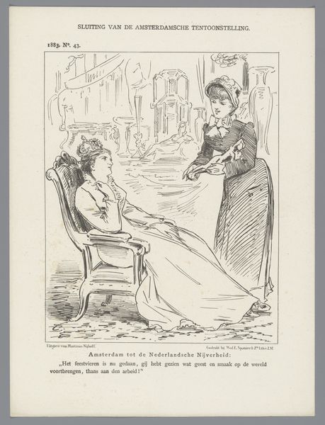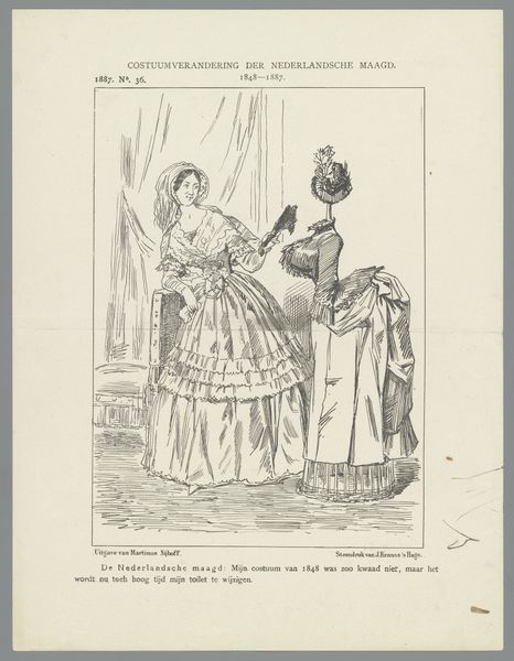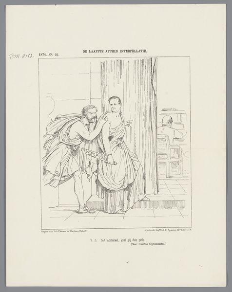 Johan Michaël Schmidt Crans created this print in 1874 using etching. Its contrasting blacks and whites immediately draw the eye, presenting a stark commentary on Dutch politics. The composition is structured around two figures, each meticulously detailed with fine, deliberate lines. The female figure, boldly labeled "Eerste Kamer," dominates the left, her form draped in fabric that suggests both power and obstruction. Facing her is a male figure, presumably representing the principle of lower education, rendered with a more subdued and tentative line. The artist employs line not merely to depict form but to convey meaning. The etching technique allows for a depth of texture, giving weight to the political critique embedded within the scene. This direct approach, devoid of color, invites us to dissect the underlying power dynamics at play. The arrangement challenges fixed notions about progress and resistance within the context of late 19th-century Dutch society.