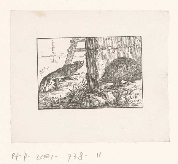 Kees Stoop made this etching, "Vogelkop en rieten dak," probably sometime in the late twentieth century. Look at the way the tones are built up with these tiny, tiny lines, like he’s constructing the image bit by bit. It’s a slow, deliberate process, etching, you have to really commit. And what a strange pairing of images! The thatched roof and the trees behind have this kind of cozy, domestic feel. Then you’ve got this stark, almost aggressive bird head stuck on the side. The beak is so pointy! The texture of the bird’s feathers are so different to the surface of the thatch - it's interesting to see how an artist can make such different marks with the same tool. It's like two different worlds colliding. It reminds me a little of the surrealist collages of Max Ernst, the way he'd bring together these disparate images and create a new, unsettling reality. With surrealism there's never one true meaning but somehow, they create worlds that feel both familiar and deeply strange.