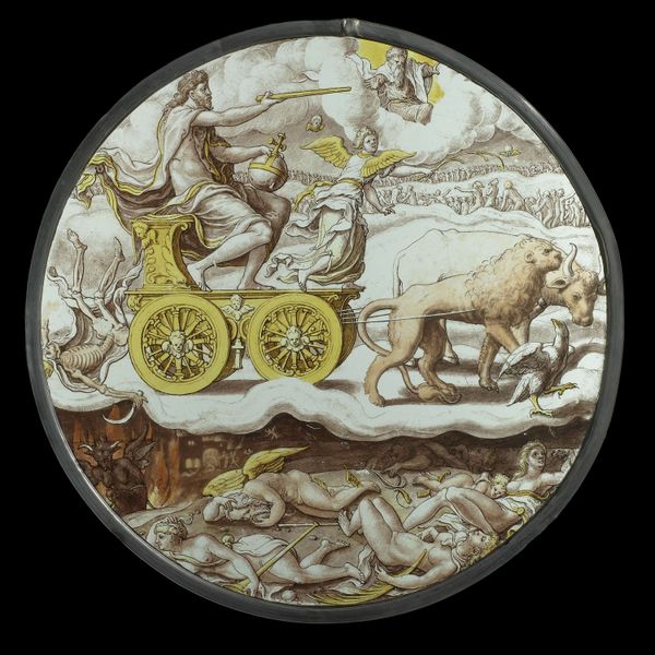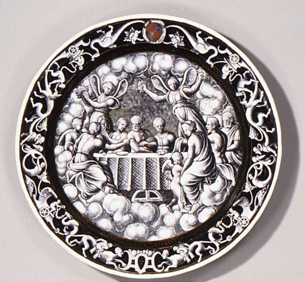 This is an enameled earthenware plate, depicting the month of October, made by Pierre Reymond in the mid-16th century. The plate’s design is structured by a clear division between the central scene and the decorative border. In the center, a monochromatic landscape shows two peasants gathering wood, their figures rendered with precise detail. Note the contrast between the active figure wielding an axe and the more static one bundling wood. This juxtaposition animates the scene, drawing our eye across the plate. Encircling this vignette is a complex border filled with stylized grotesques and emblems. The use of black enamel, punctuated by touches of gold, creates a frame that is both ornamental and symbolic, reflecting the Renaissance fascination with classical motifs and heraldry. Reymond’s plate, therefore, is more than mere decoration. It’s a structured composition, carefully balancing form and content, tradition and innovation. It invites us to decode its visual language and reflect on its cultural context.
