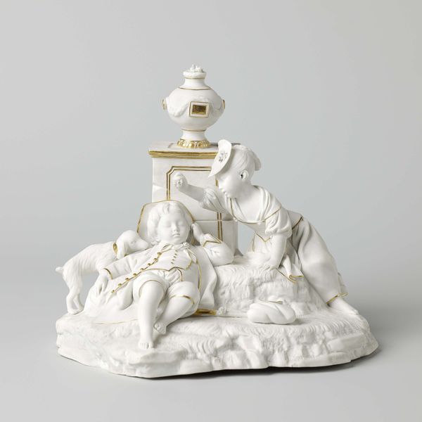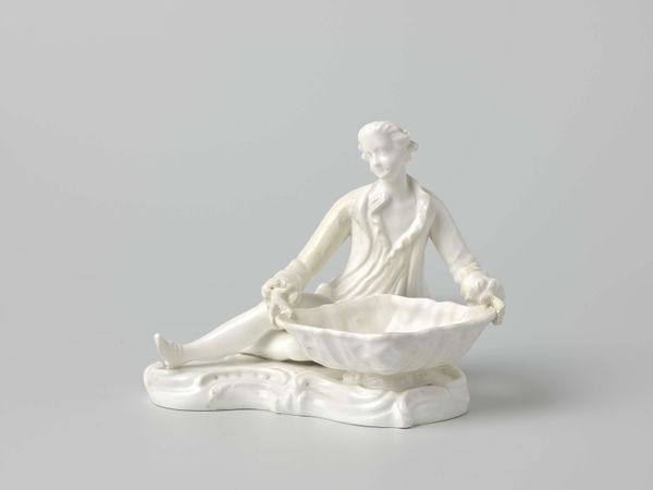 Editor: This intriguing ceramic piece from the mid-19th century shows a semi-reclining woman holding a basket. The anonymous artist created something that feels both intimate and ornamental. What do you make of it? Curator: Well, the enduring image of a woman and a basket certainly evokes ideas of plenty and nurturance, but it’s all wrapped in a very particular period aesthetic. Does the woman appear to be laboring, offering sustenance, or is there something else? Editor: It's hard to say. The whiteness of the ceramic almost drains any sense of activity. She feels more like a statue than someone alive. Curator: Exactly. Consider then how classical figures are frequently presented in this neutral form and their association with virtues, like wisdom or justice. What "virtue" might this sculpture embody, and how might its meaning change for different viewers? Is it a vessel of tradition or a romanticized view of women as decorative? Editor: I never considered the connection to classical sculptures before, even though they look very similar. So maybe the basket she’s holding is also more symbolic. Curator: Perhaps it refers to domestic roles assigned to women during that era. Its symbolism continues to transform with contemporary views. Editor: So its meaning continues to change? Curator: The work acts like a mirror reflecting the viewer’s own beliefs, biases, and hopes related to culture and femininity. Editor: That's such a fascinating point. I guess there is a reason symbols still resonate today. Thanks for helping me think this through!