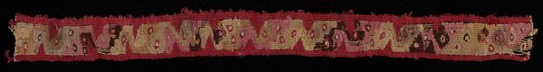 Editor: Here we have a textile, “Band,” created by the Nazca people, dating possibly from 700 to 900 AD. It’s currently held at the Art Institute of Chicago. It strikes me as so intricate and carefully crafted. How do you interpret this work? Curator: The “Band,” like many textiles of its time, isn't merely decorative. It's a potent carrier of meaning. Consider the repeated geometric patterns. Do they evoke something to you? Editor: Well, there's a rhythm, a visual pulse. But beyond that, I'm not sure. Curator: The repetition itself speaks to a cultural memory, wouldn't you say? Patterns are rarely arbitrary in these contexts. Each motif, passed down generations, could be symbolic of nature, myth, or even social standing. Editor: So, almost like a written language, woven into fabric? Curator: Precisely! These indigenous American textiles used imagery in ways comparable to writing; they contain vital cultural information. Look at the colors. Can you perceive emotional impact? Editor: Definitely. There are warm reds and yellows juxtaposed with cooler blues and darker tones. Maybe representing duality or balance? Curator: Yes! Color theory wasn’t something “discovered” in the modern era; these craftspeople wielded it consciously. They had acute knowledge about how certain colors impact perception. What emotional response are you left with? Editor: I am struck by the skill of the weaver and the depth of meaning woven into the piece. Curator: Me too, thinking about these textiles from a perspective of cultural memory is always insightful. I wonder how it makes the work more interesting or accessible to you?