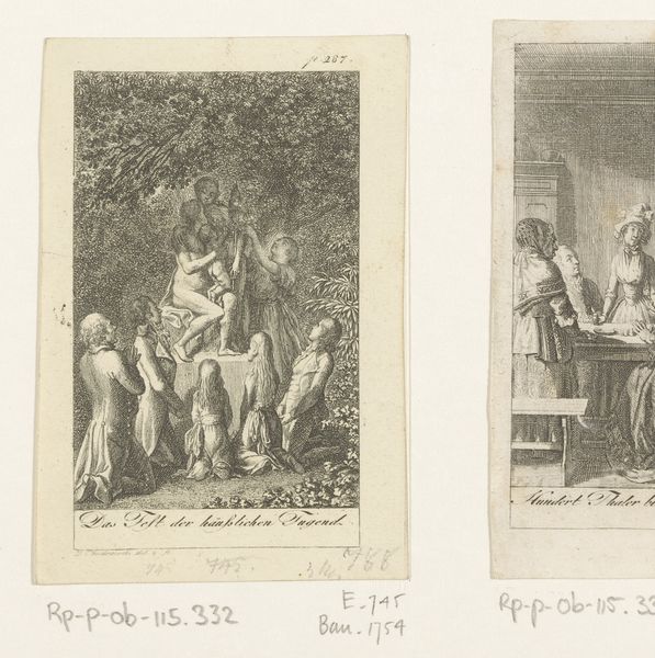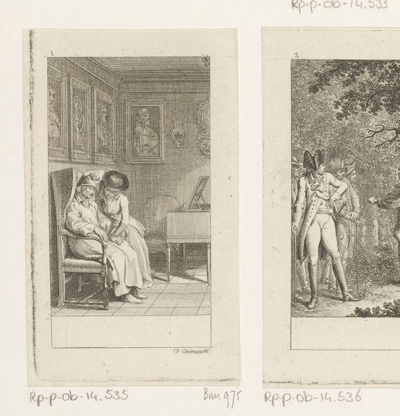 Editor: We're looking at "Twee voorstellingen uit de verhalen van Wilhelm Gottlieb Becker," or "Two Scenes from the Stories of Wilhelm Gottlieb Becker," an etching made in 1798 by Daniel Nikolaus Chodowiecki. It depicts two distinct scenes side-by-side. The scene on the left feels very intimate, a domestic moment maybe? What stands out to you? Curator: You've got a keen eye! It's an interesting pairing, isn't it? I see this as Chodowiecki playfully juxtaposing two different social spheres – the private, almost claustrophobic, world of the family on the left against the seemingly idyllic, public space on the right. I’m drawn to the texture in the left panel, how it captures the very essence of domestic simplicity of the period. It’s as though the artist is holding up a mirror to the ordinary, to expose the magic hidden within the everyday. What sort of "story" do you think the artist tried to capture? Editor: Hmm, maybe one is about duty and the other about leisure? The right scene certainly feels more romantic. The light seems softer, less harsh than indoors. It really highlights how class could affect someone's day-to-day life back then. Curator: Absolutely. Think about Becker's stories themselves. Often, they revolved around morals and manners. Chodowiecki cleverly uses light and composition to underscore these social and moral divides. It makes you wonder, what were the unspoken rules governing each space? Are these images complementary, or contrasting? What rules and expectations shape *our* daily encounters? Editor: That's given me a lot to think about! It’s fascinating how much information and questions about daily life in that period of history could be conveyed through what appears to be very simple illustration. Curator: Precisely! These pieces show, that art whispers when it can roar; and sometimes, those quietest words leave the loudest echo.