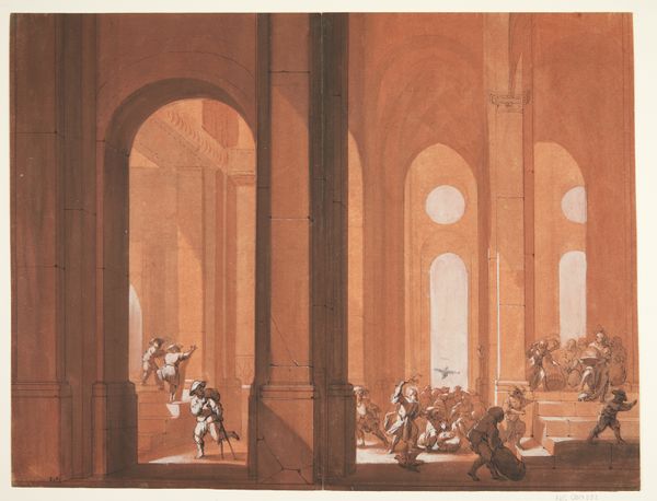 Curator: Gazing at Antonio Joli's "Roman Bath," painted around 1745, the eye is immediately drawn to its scale—the sheer volume of this imagined space is quite striking. Editor: Yes, there is an odd stillness despite the figures frolicking in the water. It almost feels like a stage set, a tableau frozen in time. It invites a closer inspection into how such displays reflect early modern constructions of history, identity, and power, not only through depicting an architectural rendering of what was presumed to be an ancient social spa, but in turn making such acts part of 18th century imagination. Curator: And it’s precisely that stagelike quality that fascinates me from a material perspective. Joli's skillful manipulation of oil paint to mimic the textures of stone, water, and human flesh is quite remarkable. Consider the labor that went into mixing the pigments, preparing the canvas, and layering the paint to achieve this illusionistic effect. Each stage contributes to a specific vision, or better, a specific fabrication, a fiction for patrons. Editor: Absolutely, the depiction certainly romanticizes leisure while potentially obscuring power dynamics. One can imagine questions of hygiene and sanitation would certainly be at play during any era where a communal bath such as this existed. Who cleaned it, and whose bodies got access, and on what terms? This imagery carries with it not just representations of architectural styles, but also assumptions about an ideal world. Curator: It's important to recall that artworks like this weren't just meant to be pretty pictures; they also served very practical purposes, such as demonstrating the artist's skill to attract further commissions. Joli had a workshop, apprentices... This 'history painting' is as much a product of labor, trade and studio management, as it is a romantic ideal. Editor: Which makes one question the accessibility and distribution chains surrounding not just the art but also that vision for Rome, especially with increased European imperialist projects around this same moment. What labor underpinned their leisurely viewing and enjoyment? How are these reflections relevant and reflective of both that period and ours? Curator: Precisely! Thinking about Joli’s Roman Bath has definitely given me a greater appreciation for both the craft and the context in which it was created. Editor: Indeed. It highlights how aesthetics often carry historical complexities concerning labor and political thought, even when portraying leisure.