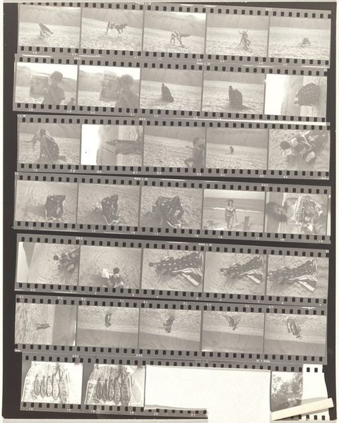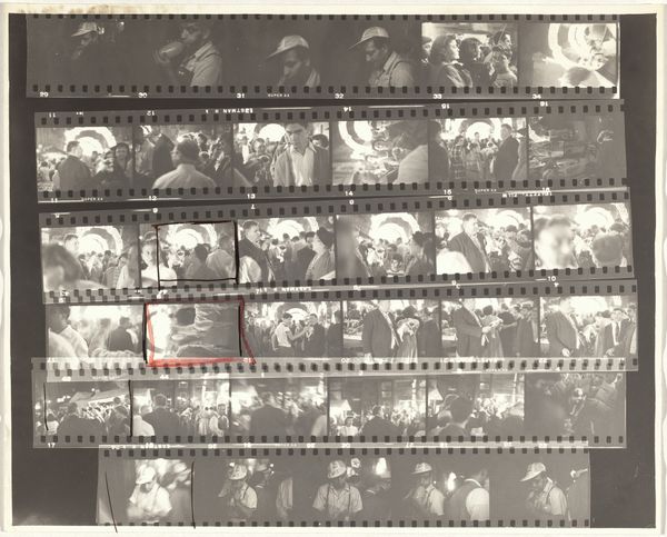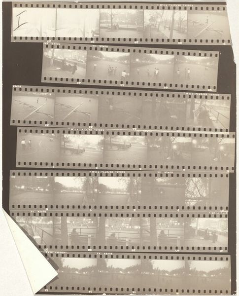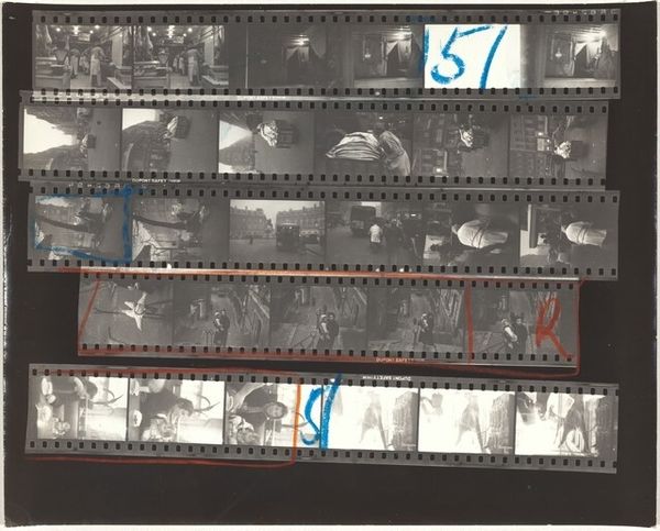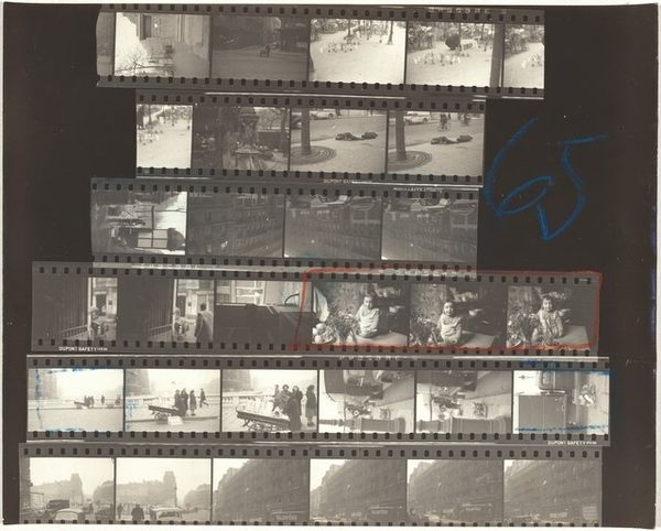 Curator: Robert Frank's "Children and Family 1A" from 1951, presented here as a contact print, is our focus. What's your initial take? Editor: The materiality is the first thing I notice—the raw, unedited feel of the contact print gives a window into Frank’s working process, into the craft. Seeing all the frames laid out like this makes me think about the labor behind image making. Curator: Absolutely. This work resonates deeply when viewed through the lens of the traditional family unit and societal expectations. Each strip encapsulates a story, yet hints at a broader narrative around motherhood. Editor: I see it as a kind of fragmented documentary, maybe a kind of personal diary laid bare. This arrangement moves beyond just taking photos, it's about presenting work in a larger context with a lot of editing involved in his choosing this particular array of photographs.. Curator: His work consistently explored social dynamics, especially focusing on marginalized communities and challenging prevailing ideologies about normalcy and belonging. Editor: I'm interested in what materials are employed and why he used them; you are looking to the image content, themes such as normalcy and what they represented at the time. How Frank chose to present the whole contact sheet also asks questions about labour, consumerism and photographic print practice. It’s not just about snapping a photo but the processes by which they come to exist and by extension the choices in what makes them worth taking at all! Curator: This is a crucial perspective. Frank’s use of contact sheets prompts reflection on how mass production influences our perception of these familial bonds—as a kind of repetition. Editor: Ultimately, this contact sheet encourages me to consider the labour involved, how the making and presentation itself gives agency back from any kind perceived objectivity with mass photography. Curator: Seeing his decisions laid bare in this format also reminds me that families have historically existed along all segments of intersectionality whether recognized legally and/or culturally. Editor: I am now also seeing new images; so much that this format makes visible when his vision comes to our focus, revealing truths only partially exposed by a single photograph on film during its development cycle within broader society’s structures governing the family and representation thereof in society.