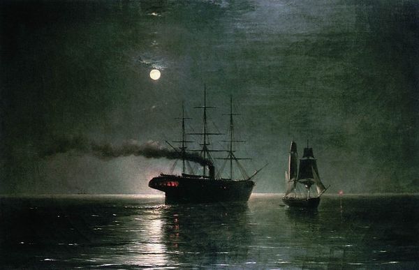 John Atkinson Grimshaw created "Lights in the Harbour" using oil on canvas. The painting evokes a sense of serene mystery through its monochromatic palette and subtle gradations of tone. Observe how the composition is structured around vertical elements – the masts of the ships – piercing the horizontal expanse of the harbor. Grimshaw masterfully uses light to delineate form; the moon's glow not only illuminates the scene but also flattens the picture plane. The artist employs a semiotic system where the harbor signifies a threshold, a liminal space between departure and arrival. The dark silhouettes of the boats, the muted colors, and obscured details invite contemplation on the themes of obscurity, transition, and the unknown. Consider how Grimshaw’s reduction of form to its most basic elements underscores a broader philosophical enquiry into the nature of perception and reality. In “Lights in the Harbour,” the aesthetic experience resides in the careful manipulation of formal elements. Meaning unfolds through the viewer's active engagement with the painting's visual language.