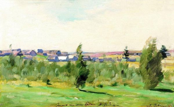 Curator: Standing before us is Isaac Levitan’s "Stormy Day," painted in 1897. It's currently housed in the Tretyakov Gallery in Moscow. A beautiful example of his landscape work. Editor: My first impression? Quiet drama. It’s not chaotic; the approaching storm is a heavy blanket, about to be dropped. The weight of that sky feels incredibly real. Curator: Absolutely, Levitan had this uncanny ability to capture the mood, the soul, of the Russian landscape. You see elements that recur often in his work—the vast sky, the feeling of melancholy. Editor: Those clouds are just monumental. Almost oppressive. I wonder about their symbolic weight, what they might represent in the Russian psyche at the time? The sense of looming change, perhaps? Curator: That’s an astute point. Remember, late 19th century Russia was a period of intense social and political upheaval. And consider that storms themselves have long symbolized cleansing and transformation in various cultures. This landscape becomes a stage for these internal struggles. Editor: The path in the foreground also fascinates me. Where does it lead? And its strange pale green, somehow unsettling... The colors feel muted and subdued as if holding their breath before the downpour. Is that a kind of foreshadowing? Curator: He uses these subtle cues so effectively. The lack of human presence, too, intensifies the focus on nature itself. It is a common technique. I like how the small wooden houses become dwarfed, as nature assumes supremacy. It is worth noting his commitment to painting "en plein air," capturing the light and atmosphere firsthand. Editor: It almost makes you consider those tiny houses—who shelters inside, what their lives might be like, seen against that elemental backdrop. I can't help reading a broader socio-political symbolism. Do you see any echo to earlier artistic conventions in its compositions? Curator: Absolutely. You could say it's got hints of Romanticism in its grandeur. While Levitan's definitely carving his own path, his work acknowledges what came before. This interplay between raw feeling and formal training is one of the key traits that distinguishes many paintings created at this time. Editor: Considering our present era, constantly shadowed by weather patterns and climate change, I’m newly drawn to how Levitan presents nature—as both beautiful and foreboding, nurturing but with the capacity for monumental force. Curator: A final observation might be that it makes you mindful of nature's constant presence and humanity's small position in its vast tapestry. Editor: Yes, its emotional tenor feels extremely contemporary, perhaps even more so than it did 125 years ago.