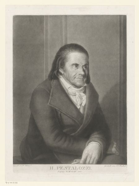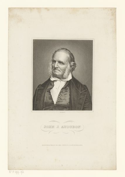 Editor: This is a portrait of John James Audubon, from "The Gallery of Illustrious Americans", engraved by Francis d' Avignon around 1850. It has an austere but very refined quality, almost luminous in the face, set against this rather indistinct landscape background. How do you interpret this work formally? Curator: The work's power rests in the contrast between the sharp, meticulous engraving of Audubon's face and the softer, more atmospheric background. Observe how d' Avignon uses line weight and density to define form and texture in the face—the precise rendering of the wrinkles, the controlled curls of the hair. Note, however, how those strong diagonals converge to lead our eye towards the landscape elements behind the figure. Editor: The focus is definitely on the face! Curator: Precisely. The composition uses an oval format to tightly frame Audubon, further intensifying our concentration. Also, the limited tonal range adds a classic, almost neoclassical feel to the piece, don’t you agree? Editor: It does evoke a sense of restrained grandeur. Is that typical of portraiture of the time? Curator: It's a common, yet effective strategy of elevating the sitter using form. The artist, by carefully modulating light and shadow, sculpts Audubon's features to suggest intellect and strength. This is achieved almost entirely through the modulation of greyscale and without relying on strong contrasting colour. Editor: That’s a great way to put it, elevates the sitter! It’s interesting to think about how even in a monochromatic image, the use of light can sculpt the figure, as you say. Curator: Exactly, and it allows us to consider how the work signifies authority purely through its aesthetic construction. We learn a lot by appreciating such a finely crafted and visually appealing print.