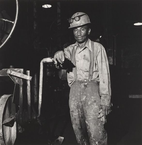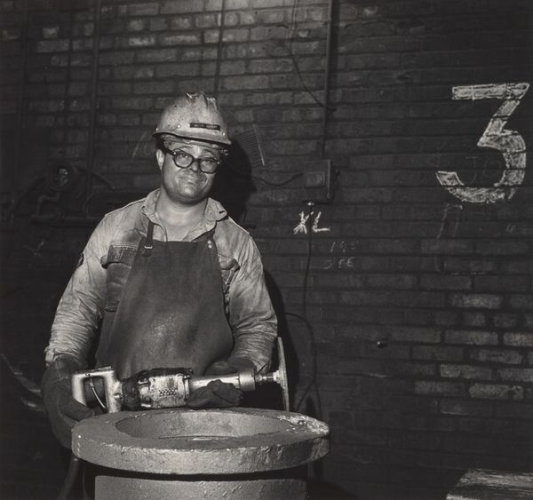 Curator: Milton Rogovin’s photograph, "Retiree, Atlas Steel Casting" from his "Working People" series, taken in 1978, is a powerful gelatin-silver print. What are your initial thoughts? Editor: Immediately, I'm struck by the dynamic contrast. The sharp, bright sparks of the welding arc explode against the gritty, muted tones of the industrial setting. There’s a real tension created between light and shadow, almost like a dance. Curator: The formal composition reinforces that tension, doesn’t it? Rogovin utilizes a relatively shallow depth of field, focusing attention on the immediate action of welding, while the periphery, though present, feels secondary. Note also how the strong diagonal lines, from the sparks and structural elements, contribute to this energetic, yet grounded effect. Editor: Absolutely. And from a historical perspective, this image is deeply resonant. Rogovin's project documenting working people is more than just an aesthetic study; it's a testament to the lives, struggles, and dignity of laborers during a period of deindustrialization. Atlas Steel Casting becomes emblematic of that era. Curator: Precisely. The socio-political forces shaping the working class are implicitly present. Rogovin employs a direct, unvarnished realism that transcends simple documentation. Consider how the anonymity created by the welder's mask invites a consideration of labor itself rather than the individual worker. Editor: That anonymity serves a critical function, highlighting the worker's role within a system. It subtly calls attention to questions of labor conditions, worker safety, and economic disparity. What are we saying, as a society, with how and under what conditions these workers are tasked to spend their days? Curator: True, but don't disregard the photograph's formal appeal; consider the stark, nearly geometric quality of shapes and forms. This is hardly a mere document. It transforms industrial labor into a tableau that carries its own powerful visual weight. Editor: I agree completely. What Rogovin manages to do here is render what might seem mundane as momentous, turning industry not just into work, but the raw stuff from which history itself is forged. Curator: Seeing this piece makes me think about how even seemingly "objective" images have compositional underpinnings, affecting how a viewer experiences them. Editor: And it shows us how portraits of labor serve not just as documentation, but powerful instruments for societal contemplation.